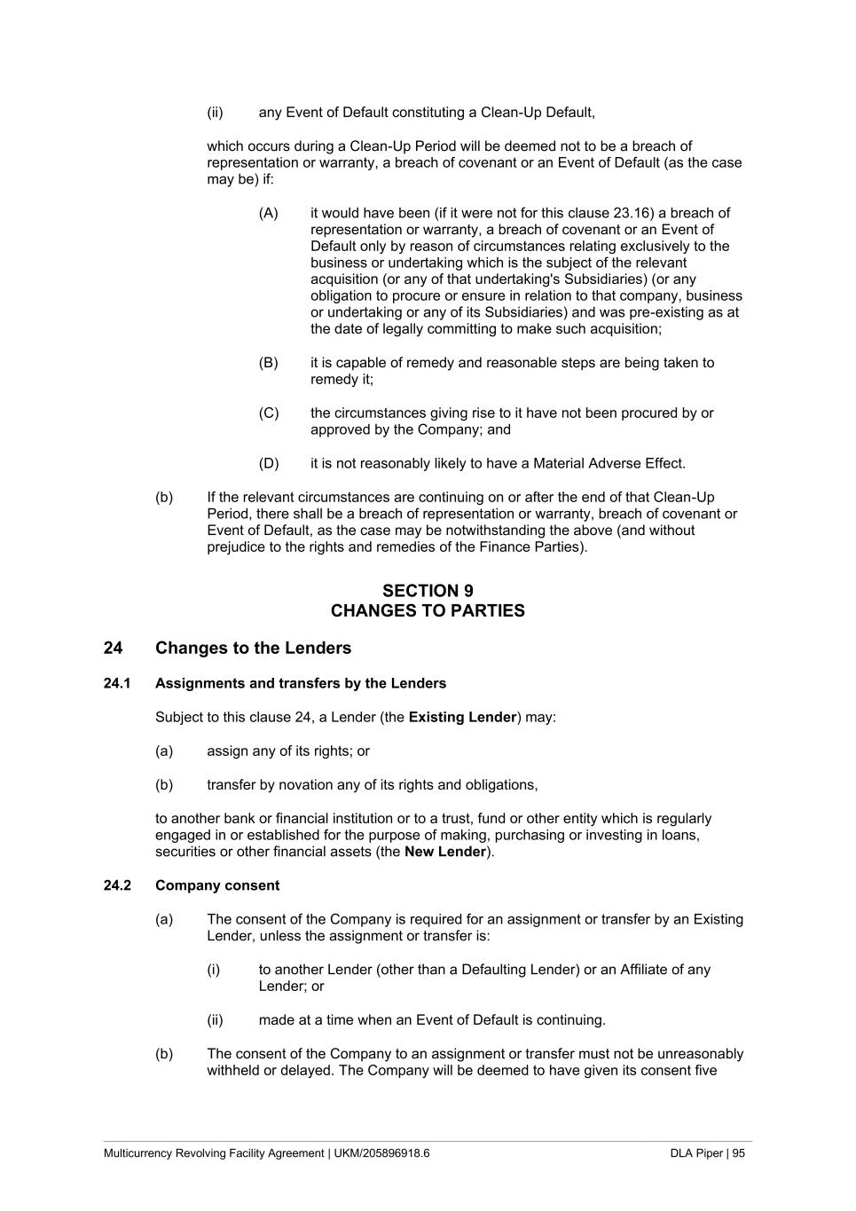 Multicurrency Revolving Facility Agreement | UKM/205896918.6 DLA Piper | 95 (ii) any Event of Default constituting a Clean-Up Default, which occurs during a Clean-Up Period will be deemed not to be a breach of representation or warranty, a breach of covenant or an Event of Default (as the case may be) if: (A) it would have been (if it were not for this clause 23.16) a breach of representation or warranty, a breach of covenant or an Event of Default only by reason of circumstances relating exclusively to the business or undertaking which is the subject of the relevant acquisition (or any of that undertaking's Subsidiaries) (or any obligation to procure or ensure in relation to that company, business or undertaking or any of its Subsidiaries) and was pre-existing as at the date of legally committing to make such acquisition; (B) it is capable of remedy and reasonable steps are being taken to remedy it; (C) the circumstances giving rise to it have not been procured by or approved by the Company; and (D) it is not reasonably likely to have a Material Adverse Effect. (b) If the relevant circumstances are continuing on or after the end of that Clean-Up Period, there shall be a breach of representation or warranty, breach of covenant or Event of Default, as the case may be notwithstanding the above (and without prejudice to the rights and remedies of the Finance Parties). SECTION 9 CHANGES TO PARTIES 24 Changes to the Lenders 24.1 Assignments and transfers by the Lenders Subject to this clause 24, a Lender (the Existing Lender) may: (a) assign any of its rights; or (b) transfer by novation any of its rights and obligations, to another bank or financial institution or to a trust, fund or other entity which is regularly engaged in or established for the purpose of making, purchasing or investing in loans, securities or other financial assets (the New Lender). 24.2 Company consent (a) The consent of the Company is required for an assignment or transfer by an Existing Lender, unless the assignment or transfer is: (i) to another Lender (other than a Defaulting Lender) or an Affiliate of any Lender; or (ii) made at a time when an Event of Default is continuing. (b) The consent of the Company to an assignment or transfer must not be unreasonably withheld or delayed. The Company will be deemed to have given its consent five