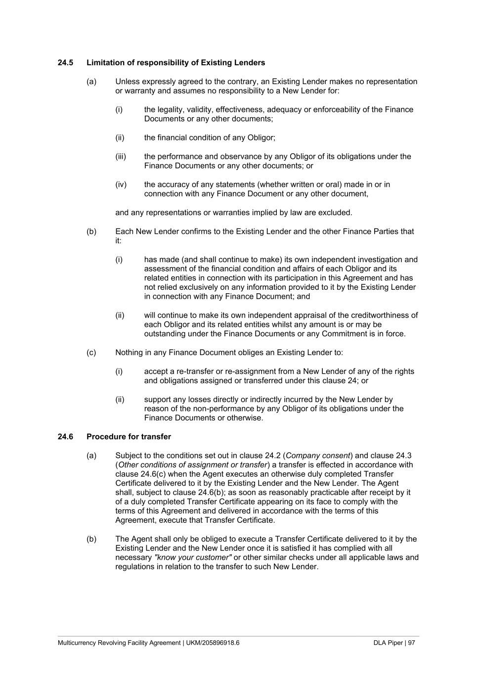 Multicurrency Revolving Facility Agreement | UKM/205896918.6 DLA Piper | 97 24.5 Limitation of responsibility of Existing Lenders (a) Unless expressly agreed to the contrary, an Existing Lender makes no representation or warranty and assumes no responsibility to a New Lender for: (i) the legality, validity, effectiveness, adequacy or enforceability of the Finance Documents or any other documents; (ii) the financial condition of any Obligor; (iii) the performance and observance by any Obligor of its obligations under the Finance Documents or any other documents; or (iv) the accuracy of any statements (whether written or oral) made in or in connection with any Finance Document or any other document, and any representations or warranties implied by law are excluded. (b) Each New Lender confirms to the Existing Lender and the other Finance Parties that it: (i) has made (and shall continue to make) its own independent investigation and assessment of the financial condition and affairs of each Obligor and its related entities in connection with its participation in this Agreement and has not relied exclusively on any information provided to it by the Existing Lender in connection with any Finance Document; and (ii) will continue to make its own independent appraisal of the creditworthiness of each Obligor and its related entities whilst any amount is or may be outstanding under the Finance Documents or any Commitment is in force. (c) Nothing in any Finance Document obliges an Existing Lender to: (i) accept a re-transfer or re-assignment from a New Lender of any of the rights and obligations assigned or transferred under this clause 24; or (ii) support any losses directly or indirectly incurred by the New Lender by reason of the non-performance by any Obligor of its obligations under the Finance Documents or otherwise. 24.6 Procedure for transfer (a) Subject to the conditions set out in clause 24.2 (Company consent) and clause 24.3 (Other conditions of assignment or transfer) a transfer is effected in accordance with clause 24.6(c) when the Agent executes an otherwise duly completed Transfer Certificate delivered to it by the Existing Lender and the New Lender. The Agent shall, subject to clause 24.6(b); as soon as reasonably practicable after receipt by it of a duly completed Transfer Certificate appearing on its face to comply with the terms of this Agreement and delivered in accordance with the terms of this Agreement, execute that Transfer Certificate. (b) The Agent shall only be obliged to execute a Transfer Certificate delivered to it by the Existing Lender and the New Lender once it is satisfied it has complied with all necessary "know your customer" or other similar checks under all applicable laws and regulations in relation to the transfer to such New Lender.