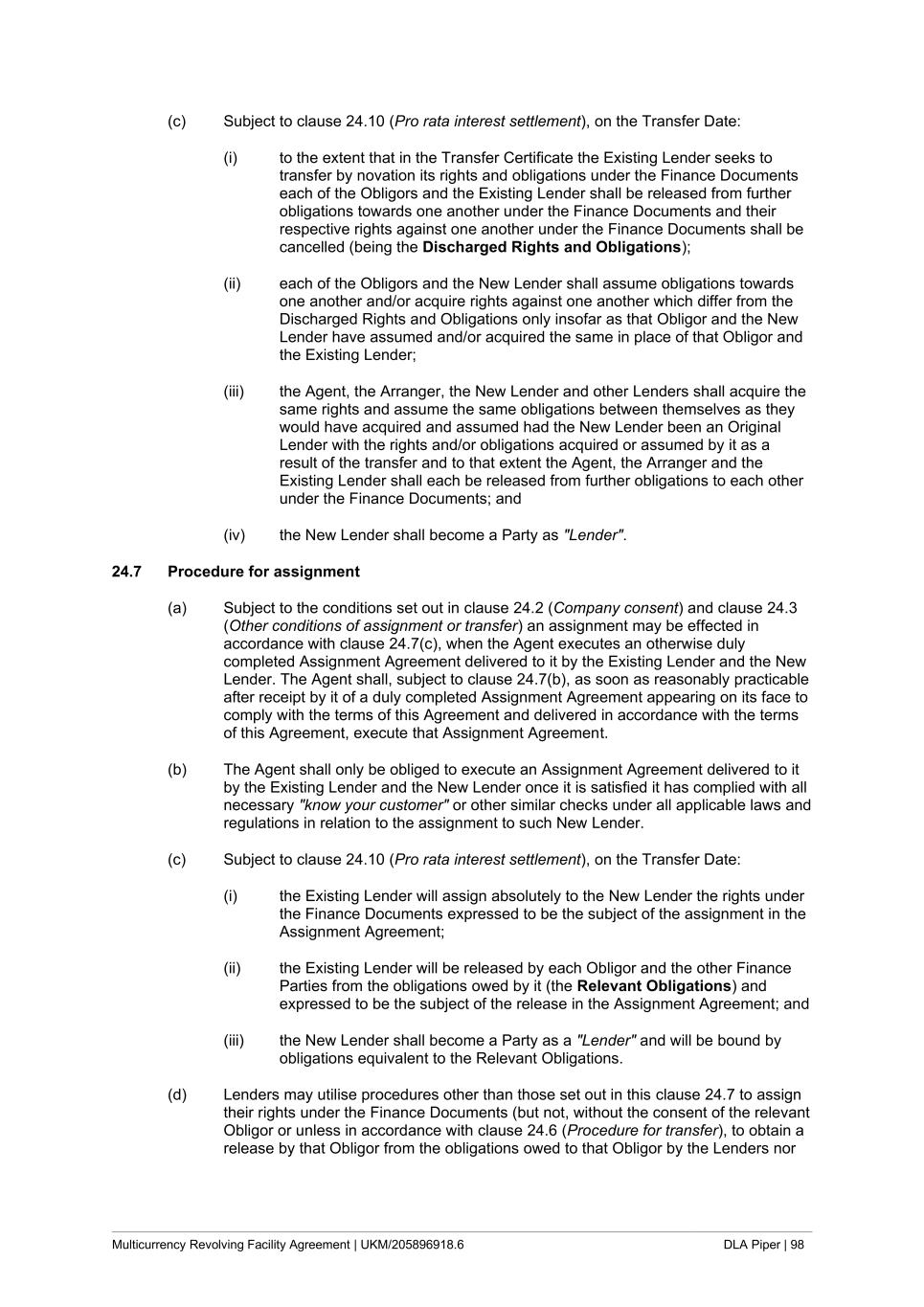 Multicurrency Revolving Facility Agreement | UKM/205896918.6 DLA Piper | 98 (c) Subject to clause 24.10 (Pro rata interest settlement), on the Transfer Date: (i) to the extent that in the Transfer Certificate the Existing Lender seeks to transfer by novation its rights and obligations under the Finance Documents each of the Obligors and the Existing Lender shall be released from further obligations towards one another under the Finance Documents and their respective rights against one another under the Finance Documents shall be cancelled (being the Discharged Rights and Obligations); (ii) each of the Obligors and the New Lender shall assume obligations towards one another and/or acquire rights against one another which differ from the Discharged Rights and Obligations only insofar as that Obligor and the New Lender have assumed and/or acquired the same in place of that Obligor and the Existing Lender; (iii) the Agent, the Arranger, the New Lender and other Lenders shall acquire the same rights and assume the same obligations between themselves as they would have acquired and assumed had the New Lender been an Original Lender with the rights and/or obligations acquired or assumed by it as a result of the transfer and to that extent the Agent, the Arranger and the Existing Lender shall each be released from further obligations to each other under the Finance Documents; and (iv) the New Lender shall become a Party as "Lender". 24.7 Procedure for assignment (a) Subject to the conditions set out in clause 24.2 (Company consent) and clause 24.3 (Other conditions of assignment or transfer) an assignment may be effected in accordance with clause 24.7(c), when the Agent executes an otherwise duly completed Assignment Agreement delivered to it by the Existing Lender and the New Lender. The Agent shall, subject to clause 24.7(b), as soon as reasonably practicable after receipt by it of a duly completed Assignment Agreement appearing on its face to comply with the terms of this Agreement and delivered in accordance with the terms of this Agreement, execute that Assignment Agreement. (b) The Agent shall only be obliged to execute an Assignment Agreement delivered to it by the Existing Lender and the New Lender once it is satisfied it has complied with all necessary "know your customer" or other similar checks under all applicable laws and regulations in relation to the assignment to such New Lender. (c) Subject to clause 24.10 (Pro rata interest settlement), on the Transfer Date: (i) the Existing Lender will assign absolutely to the New Lender the rights under the Finance Documents expressed to be the subject of the assignment in the Assignment Agreement; (ii) the Existing Lender will be released by each Obligor and the other Finance Parties from the obligations owed by it (the Relevant Obligations) and expressed to be the subject of the release in the Assignment Agreement; and (iii) the New Lender shall become a Party as a "Lender" and will be bound by obligations equivalent to the Relevant Obligations. (d) Lenders may utilise procedures other than those set out in this clause 24.7 to assign their rights under the Finance Documents (but not, without the consent of the relevant Obligor or unless in accordance with clause 24.6 (Procedure for transfer), to obtain a release by that Obligor from the obligations owed to that Obligor by the Lenders nor