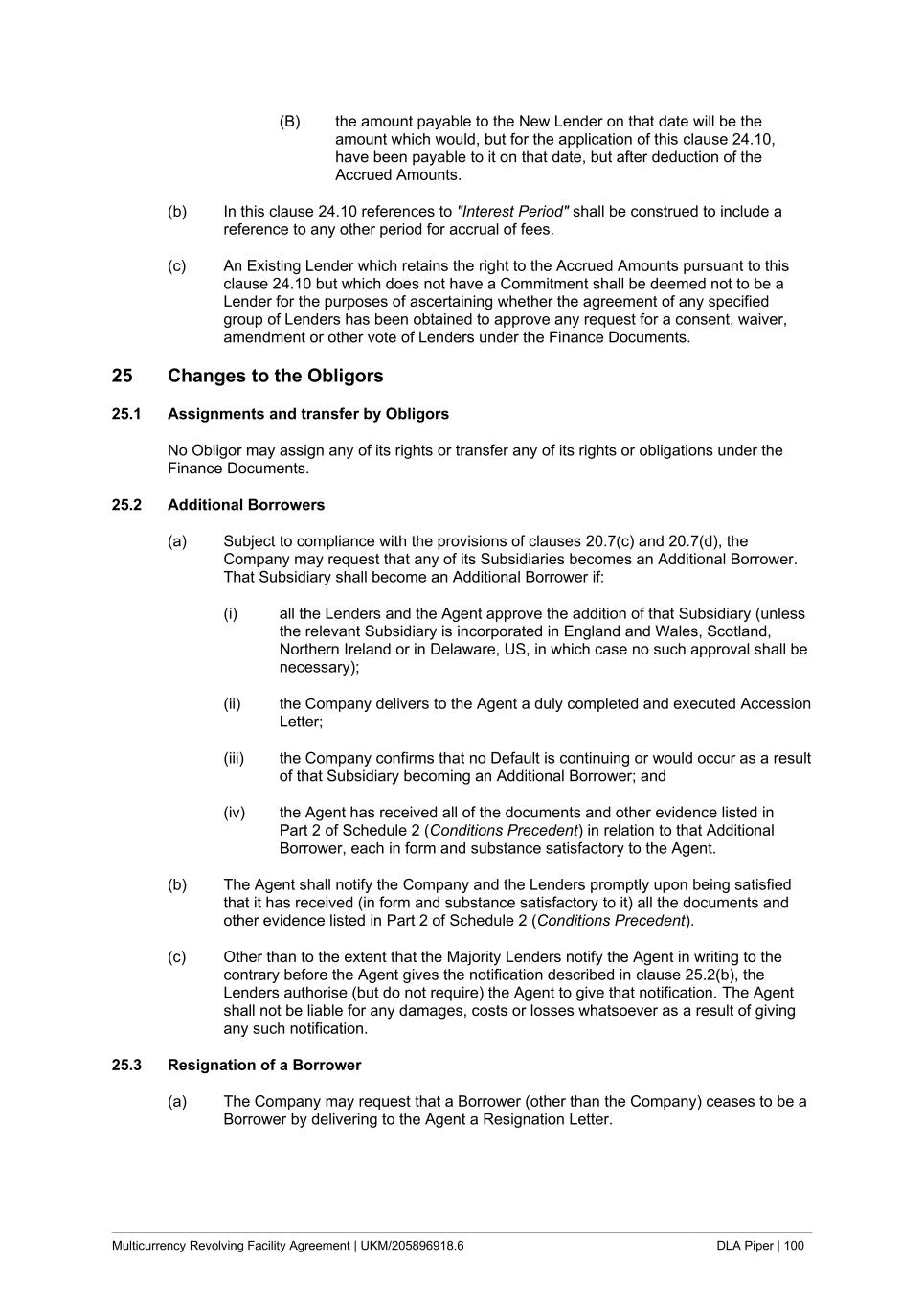Multicurrency Revolving Facility Agreement | UKM/205896918.6 DLA Piper | 100 (B) the amount payable to the New Lender on that date will be the amount which would, but for the application of this clause 24.10, have been payable to it on that date, but after deduction of the Accrued Amounts. (b) In this clause 24.10 references to "Interest Period" shall be construed to include a reference to any other period for accrual of fees. (c) An Existing Lender which retains the right to the Accrued Amounts pursuant to this clause 24.10 but which does not have a Commitment shall be deemed not to be a Lender for the purposes of ascertaining whether the agreement of any specified group of Lenders has been obtained to approve any request for a consent, waiver, amendment or other vote of Lenders under the Finance Documents. 25 Changes to the Obligors 25.1 Assignments and transfer by Obligors No Obligor may assign any of its rights or transfer any of its rights or obligations under the Finance Documents. 25.2 Additional Borrowers (a) Subject to compliance with the provisions of clauses 20.7(c) and 20.7(d), the Company may request that any of its Subsidiaries becomes an Additional Borrower. That Subsidiary shall become an Additional Borrower if: (i) all the Lenders and the Agent approve the addition of that Subsidiary (unless the relevant Subsidiary is incorporated in England and Wales, Scotland, Northern Ireland or in Delaware, US, in which case no such approval shall be necessary); (ii) the Company delivers to the Agent a duly completed and executed Accession Letter; (iii) the Company confirms that no Default is continuing or would occur as a result of that Subsidiary becoming an Additional Borrower; and (iv) the Agent has received all of the documents and other evidence listed in Part 2 of Schedule 2 (Conditions Precedent) in relation to that Additional Borrower, each in form and substance satisfactory to the Agent. (b) The Agent shall notify the Company and the Lenders promptly upon being satisfied that it has received (in form and substance satisfactory to it) all the documents and other evidence listed in Part 2 of Schedule 2 (Conditions Precedent). (c) Other than to the extent that the Majority Lenders notify the Agent in writing to the contrary before the Agent gives the notification described in clause 25.2(b), the Lenders authorise (but do not require) the Agent to give that notification. The Agent shall not be liable for any damages, costs or losses whatsoever as a result of giving any such notification. 25.3 Resignation of a Borrower (a) The Company may request that a Borrower (other than the Company) ceases to be a Borrower by delivering to the Agent a Resignation Letter.