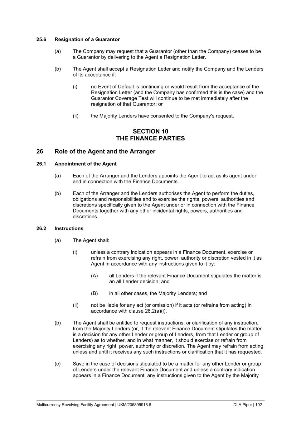 Multicurrency Revolving Facility Agreement | UKM/205896918.6 DLA Piper | 102 25.6 Resignation of a Guarantor (a) The Company may request that a Guarantor (other than the Company) ceases to be a Guarantor by delivering to the Agent a Resignation Letter. (b) The Agent shall accept a Resignation Letter and notify the Company and the Lenders of its acceptance if: (i) no Event of Default is continuing or would result from the acceptance of the Resignation Letter (and the Company has confirmed this is the case) and the Guarantor Coverage Test will continue to be met immediately after the resignation of that Guarantor; or (ii) the Majority Lenders have consented to the Company's request. SECTION 10 THE FINANCE PARTIES 26 Role of the Agent and the Arranger 26.1 Appointment of the Agent (a) Each of the Arranger and the Lenders appoints the Agent to act as its agent under and in connection with the Finance Documents. (b) Each of the Arranger and the Lenders authorises the Agent to perform the duties, obligations and responsibilities and to exercise the rights, powers, authorities and discretions specifically given to the Agent under or in connection with the Finance Documents together with any other incidental rights, powers, authorities and discretions. 26.2 Instructions (a) The Agent shall: (i) unless a contrary indication appears in a Finance Document, exercise or refrain from exercising any right, power, authority or discretion vested in it as Agent in accordance with any instructions given to it by: (A) all Lenders if the relevant Finance Document stipulates the matter is an all Lender decision; and (B) in all other cases, the Majority Lenders; and (ii) not be liable for any act (or omission) if it acts (or refrains from acting) in accordance with clause 26.2(a)(i). (b) The Agent shall be entitled to request instructions, or clarification of any instruction, from the Majority Lenders (or, if the relevant Finance Document stipulates the matter is a decision for any other Lender or group of Lenders, from that Lender or group of Lenders) as to whether, and in what manner, it should exercise or refrain from exercising any right, power, authority or discretion. The Agent may refrain from acting unless and until it receives any such instructions or clarification that it has requested. (c) Save in the case of decisions stipulated to be a matter for any other Lender or group of Lenders under the relevant Finance Document and unless a contrary indication appears in a Finance Document, any instructions given to the Agent by the Majority
