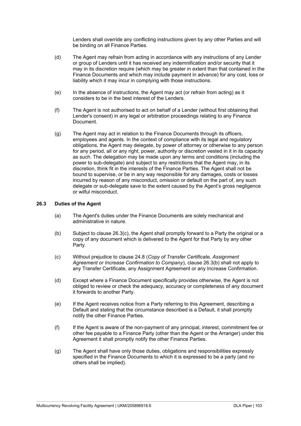 Multicurrency Revolving Facility Agreement | UKM/205896918.6 DLA Piper | 103 Lenders shall override any conflicting instructions given by any other Parties and will be binding on all Finance Parties. (d) The Agent may refrain from acting in accordance with any instructions of any Lender or group of Lenders until it has received any indemnification and/or security that it may in its discretion require (which may be greater in extent than that contained in the Finance Documents and which may include payment in advance) for any cost, loss or liability which it may incur in complying with those instructions. (e) In the absence of instructions, the Agent may act (or refrain from acting) as it considers to be in the best interest of the Lenders. (f) The Agent is not authorised to act on behalf of a Lender (without first obtaining that Lender's consent) in any legal or arbitration proceedings relating to any Finance Document. (g) The Agent may act in relation to the Finance Documents through its officers, employees and agents. In the context of compliance with its legal and regulatory obligations, the Agent may delegate, by power of attorney or otherwise to any person for any period, all or any right, power, authority or discretion vested in it in its capacity as such. The delegation may be made upon any terms and conditions (including the power to sub-delegate) and subject to any restrictions that the Agent may, in its discretion, think fit in the interests of the Finance Parties. The Agent shall not be bound to supervise, or be in any way responsible for any damages, costs or losses incurred by reason of any misconduct, omission or default on the part of, any such delegate or sub-delegate save to the extent caused by the Agent’s gross negligence or wilful misconduct. 26.3 Duties of the Agent (a) The Agent's duties under the Finance Documents are solely mechanical and administrative in nature. (b) Subject to clause 26.3(c), the Agent shall promptly forward to a Party the original or a copy of any document which is delivered to the Agent for that Party by any other Party. (c) Without prejudice to clause 24.8 (Copy of Transfer Certificate, Assignment Agreement or Increase Confirmation to Company), clause 26.3(b) shall not apply to any Transfer Certificate, any Assignment Agreement or any Increase Confirmation. (d) Except where a Finance Document specifically provides otherwise, the Agent is not obliged to review or check the adequacy, accuracy or completeness of any document it forwards to another Party. (e) If the Agent receives notice from a Party referring to this Agreement, describing a Default and stating that the circumstance described is a Default, it shall promptly notify the other Finance Parties. (f) If the Agent is aware of the non-payment of any principal, interest, commitment fee or other fee payable to a Finance Party (other than the Agent or the Arranger) under this Agreement it shall promptly notify the other Finance Parties. (g) The Agent shall have only those duties, obligations and responsibilities expressly specified in the Finance Documents to which it is expressed to be a party (and no others shall be implied).