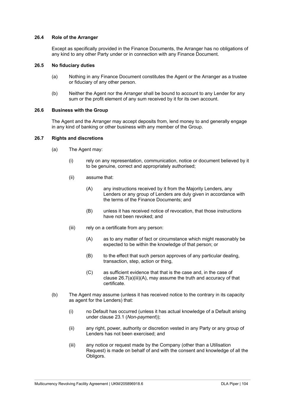 Multicurrency Revolving Facility Agreement | UKM/205896918.6 DLA Piper | 104 26.4 Role of the Arranger Except as specifically provided in the Finance Documents, the Arranger has no obligations of any kind to any other Party under or in connection with any Finance Document. 26.5 No fiduciary duties (a) Nothing in any Finance Document constitutes the Agent or the Arranger as a trustee or fiduciary of any other person. (b) Neither the Agent nor the Arranger shall be bound to account to any Lender for any sum or the profit element of any sum received by it for its own account. 26.6 Business with the Group The Agent and the Arranger may accept deposits from, lend money to and generally engage in any kind of banking or other business with any member of the Group. 26.7 Rights and discretions (a) The Agent may: (i) rely on any representation, communication, notice or document believed by it to be genuine, correct and appropriately authorised; (ii) assume that: (A) any instructions received by it from the Majority Lenders, any Lenders or any group of Lenders are duly given in accordance with the terms of the Finance Documents; and (B) unless it has received notice of revocation, that those instructions have not been revoked; and (iii) rely on a certificate from any person: (A) as to any matter of fact or circumstance which might reasonably be expected to be within the knowledge of that person; or (B) to the effect that such person approves of any particular dealing, transaction, step, action or thing, (C) as sufficient evidence that that is the case and, in the case of clause 26.7(a)(iii)(A), may assume the truth and accuracy of that certificate. (b) The Agent may assume (unless it has received notice to the contrary in its capacity as agent for the Lenders) that: (i) no Default has occurred (unless it has actual knowledge of a Default arising under clause 23.1 (Non-payment)); (ii) any right, power, authority or discretion vested in any Party or any group of Lenders has not been exercised; and (iii) any notice or request made by the Company (other than a Utilisation Request) is made on behalf of and with the consent and knowledge of all the Obligors.
