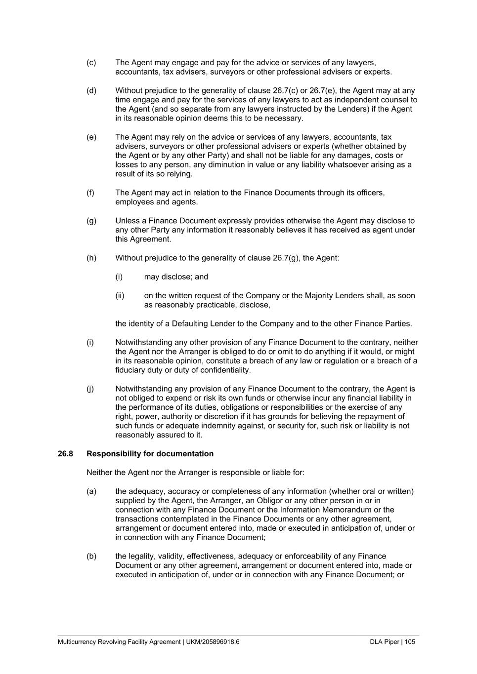 Multicurrency Revolving Facility Agreement | UKM/205896918.6 DLA Piper | 105 (c) The Agent may engage and pay for the advice or services of any lawyers, accountants, tax advisers, surveyors or other professional advisers or experts. (d) Without prejudice to the generality of clause 26.7(c) or 26.7(e), the Agent may at any time engage and pay for the services of any lawyers to act as independent counsel to the Agent (and so separate from any lawyers instructed by the Lenders) if the Agent in its reasonable opinion deems this to be necessary. (e) The Agent may rely on the advice or services of any lawyers, accountants, tax advisers, surveyors or other professional advisers or experts (whether obtained by the Agent or by any other Party) and shall not be liable for any damages, costs or losses to any person, any diminution in value or any liability whatsoever arising as a result of its so relying. (f) The Agent may act in relation to the Finance Documents through its officers, employees and agents. (g) Unless a Finance Document expressly provides otherwise the Agent may disclose to any other Party any information it reasonably believes it has received as agent under this Agreement. (h) Without prejudice to the generality of clause 26.7(g), the Agent: (i) may disclose; and (ii) on the written request of the Company or the Majority Lenders shall, as soon as reasonably practicable, disclose, the identity of a Defaulting Lender to the Company and to the other Finance Parties. (i) Notwithstanding any other provision of any Finance Document to the contrary, neither the Agent nor the Arranger is obliged to do or omit to do anything if it would, or might in its reasonable opinion, constitute a breach of any law or regulation or a breach of a fiduciary duty or duty of confidentiality. (j) Notwithstanding any provision of any Finance Document to the contrary, the Agent is not obliged to expend or risk its own funds or otherwise incur any financial liability in the performance of its duties, obligations or responsibilities or the exercise of any right, power, authority or discretion if it has grounds for believing the repayment of such funds or adequate indemnity against, or security for, such risk or liability is not reasonably assured to it. 26.8 Responsibility for documentation Neither the Agent nor the Arranger is responsible or liable for: (a) the adequacy, accuracy or completeness of any information (whether oral or written) supplied by the Agent, the Arranger, an Obligor or any other person in or in connection with any Finance Document or the Information Memorandum or the transactions contemplated in the Finance Documents or any other agreement, arrangement or document entered into, made or executed in anticipation of, under or in connection with any Finance Document; (b) the legality, validity, effectiveness, adequacy or enforceability of any Finance Document or any other agreement, arrangement or document entered into, made or executed in anticipation of, under or in connection with any Finance Document; or