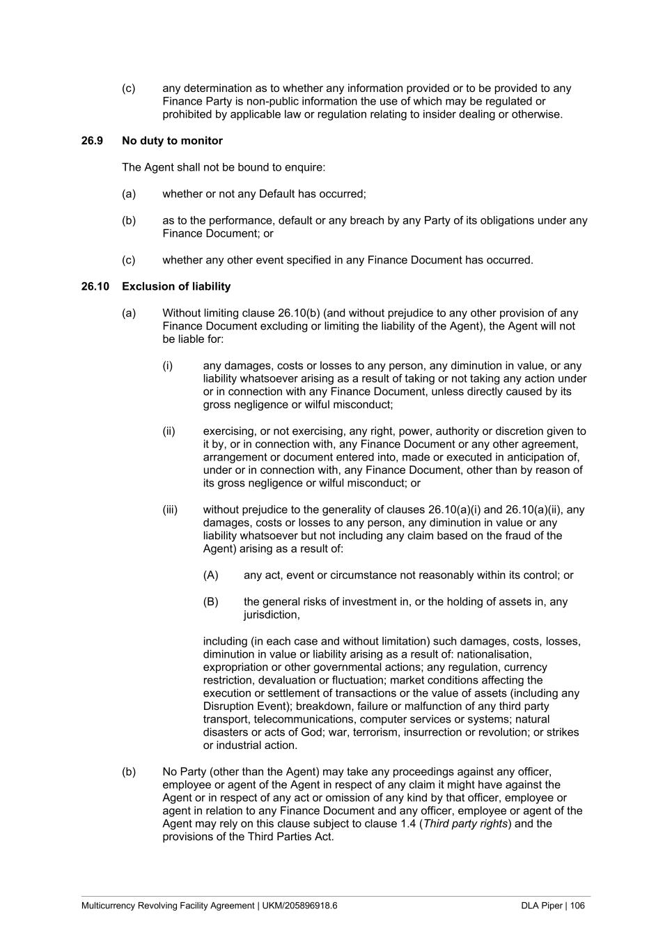 Multicurrency Revolving Facility Agreement | UKM/205896918.6 DLA Piper | 106 (c) any determination as to whether any information provided or to be provided to any Finance Party is non-public information the use of which may be regulated or prohibited by applicable law or regulation relating to insider dealing or otherwise. 26.9 No duty to monitor The Agent shall not be bound to enquire: (a) whether or not any Default has occurred; (b) as to the performance, default or any breach by any Party of its obligations under any Finance Document; or (c) whether any other event specified in any Finance Document has occurred. 26.10 Exclusion of liability (a) Without limiting clause 26.10(b) (and without prejudice to any other provision of any Finance Document excluding or limiting the liability of the Agent), the Agent will not be liable for: (i) any damages, costs or losses to any person, any diminution in value, or any liability whatsoever arising as a result of taking or not taking any action under or in connection with any Finance Document, unless directly caused by its gross negligence or wilful misconduct; (ii) exercising, or not exercising, any right, power, authority or discretion given to it by, or in connection with, any Finance Document or any other agreement, arrangement or document entered into, made or executed in anticipation of, under or in connection with, any Finance Document, other than by reason of its gross negligence or wilful misconduct; or (iii) without prejudice to the generality of clauses 26.10(a)(i) and 26.10(a)(ii), any damages, costs or losses to any person, any diminution in value or any liability whatsoever but not including any claim based on the fraud of the Agent) arising as a result of: (A) any act, event or circumstance not reasonably within its control; or (B) the general risks of investment in, or the holding of assets in, any jurisdiction, including (in each case and without limitation) such damages, costs, losses, diminution in value or liability arising as a result of: nationalisation, expropriation or other governmental actions; any regulation, currency restriction, devaluation or fluctuation; market conditions affecting the execution or settlement of transactions or the value of assets (including any Disruption Event); breakdown, failure or malfunction of any third party transport, telecommunications, computer services or systems; natural disasters or acts of God; war, terrorism, insurrection or revolution; or strikes or industrial action. (b) No Party (other than the Agent) may take any proceedings against any officer, employee or agent of the Agent in respect of any claim it might have against the Agent or in respect of any act or omission of any kind by that officer, employee or agent in relation to any Finance Document and any officer, employee or agent of the Agent may rely on this clause subject to clause 1.4 (Third party rights) and the provisions of the Third Parties Act.
