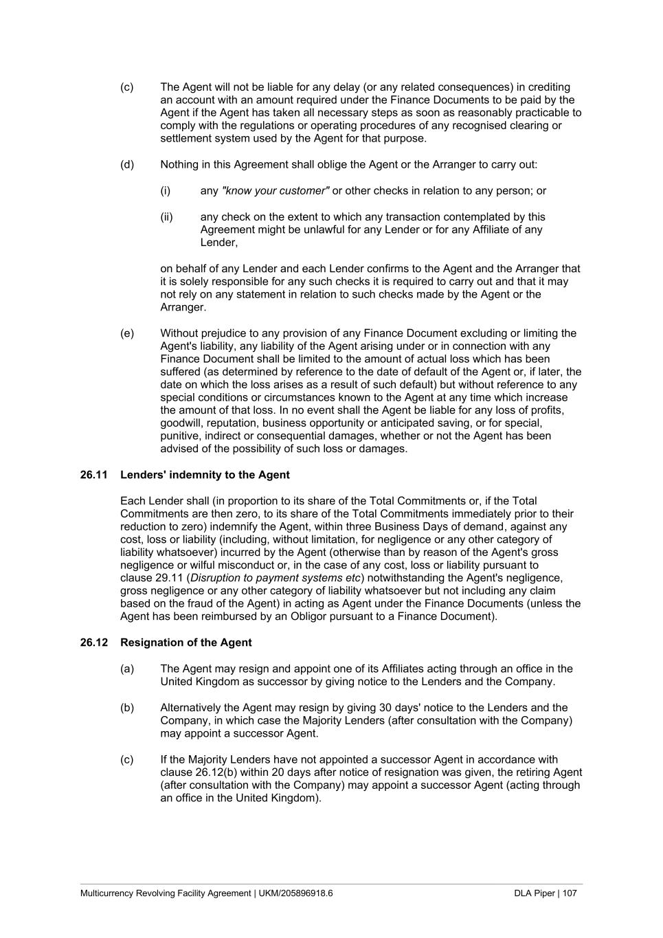 Multicurrency Revolving Facility Agreement | UKM/205896918.6 DLA Piper | 107 (c) The Agent will not be liable for any delay (or any related consequences) in crediting an account with an amount required under the Finance Documents to be paid by the Agent if the Agent has taken all necessary steps as soon as reasonably practicable to comply with the regulations or operating procedures of any recognised clearing or settlement system used by the Agent for that purpose. (d) Nothing in this Agreement shall oblige the Agent or the Arranger to carry out: (i) any "know your customer" or other checks in relation to any person; or (ii) any check on the extent to which any transaction contemplated by this Agreement might be unlawful for any Lender or for any Affiliate of any Lender, on behalf of any Lender and each Lender confirms to the Agent and the Arranger that it is solely responsible for any such checks it is required to carry out and that it may not rely on any statement in relation to such checks made by the Agent or the Arranger. (e) Without prejudice to any provision of any Finance Document excluding or limiting the Agent's liability, any liability of the Agent arising under or in connection with any Finance Document shall be limited to the amount of actual loss which has been suffered (as determined by reference to the date of default of the Agent or, if later, the date on which the loss arises as a result of such default) but without reference to any special conditions or circumstances known to the Agent at any time which increase the amount of that loss. In no event shall the Agent be liable for any loss of profits, goodwill, reputation, business opportunity or anticipated saving, or for special, punitive, indirect or consequential damages, whether or not the Agent has been advised of the possibility of such loss or damages. 26.11 Lenders' indemnity to the Agent Each Lender shall (in proportion to its share of the Total Commitments or, if the Total Commitments are then zero, to its share of the Total Commitments immediately prior to their reduction to zero) indemnify the Agent, within three Business Days of demand, against any cost, loss or liability (including, without limitation, for negligence or any other category of liability whatsoever) incurred by the Agent (otherwise than by reason of the Agent's gross negligence or wilful misconduct or, in the case of any cost, loss or liability pursuant to clause 29.11 (Disruption to payment systems etc) notwithstanding the Agent's negligence, gross negligence or any other category of liability whatsoever but not including any claim based on the fraud of the Agent) in acting as Agent under the Finance Documents (unless the Agent has been reimbursed by an Obligor pursuant to a Finance Document). 26.12 Resignation of the Agent (a) The Agent may resign and appoint one of its Affiliates acting through an office in the United Kingdom as successor by giving notice to the Lenders and the Company. (b) Alternatively the Agent may resign by giving 30 days' notice to the Lenders and the Company, in which case the Majority Lenders (after consultation with the Company) may appoint a successor Agent. (c) If the Majority Lenders have not appointed a successor Agent in accordance with clause 26.12(b) within 20 days after notice of resignation was given, the retiring Agent (after consultation with the Company) may appoint a successor Agent (acting through an office in the United Kingdom).