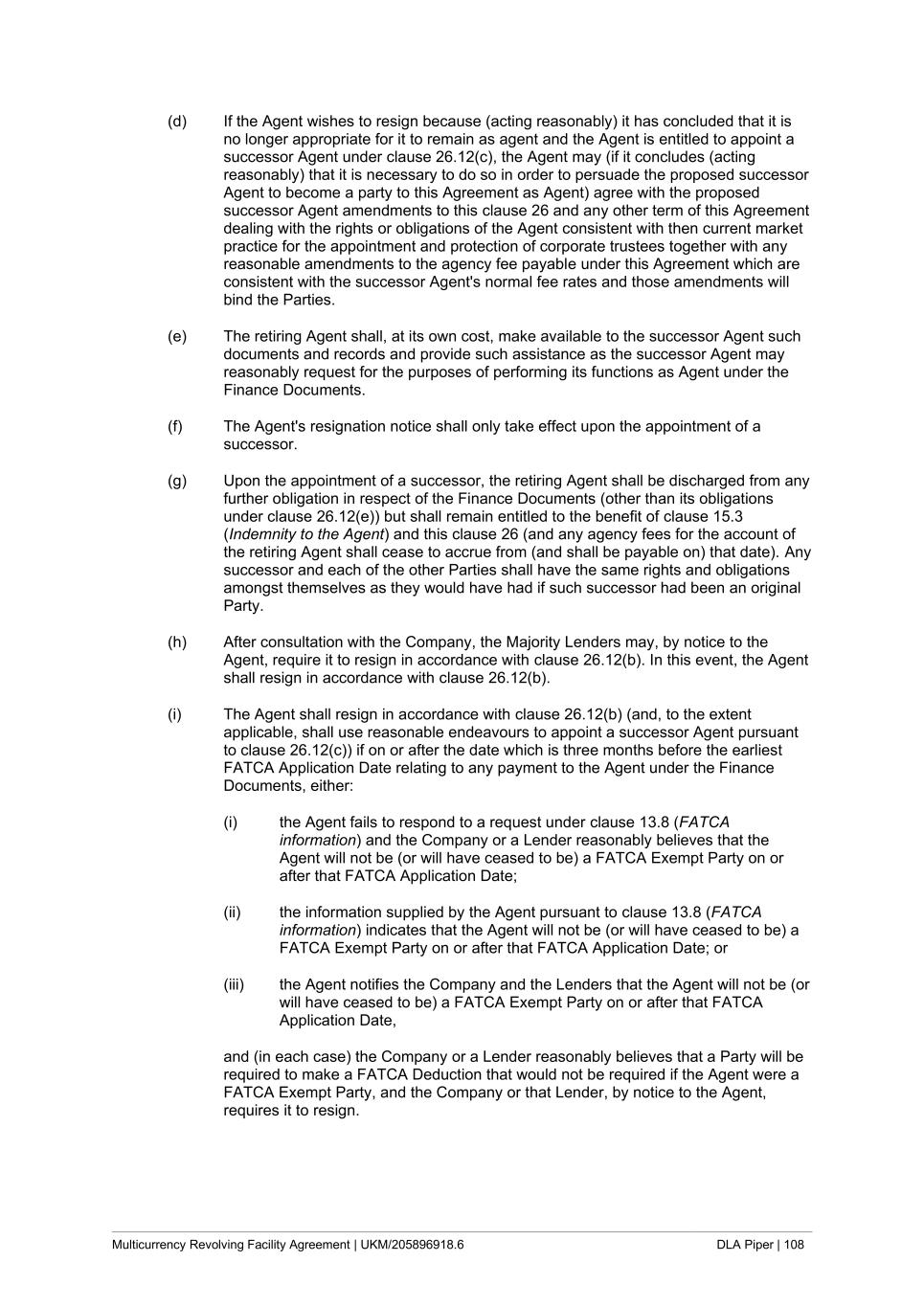 Multicurrency Revolving Facility Agreement | UKM/205896918.6 DLA Piper | 108 (d) If the Agent wishes to resign because (acting reasonably) it has concluded that it is no longer appropriate for it to remain as agent and the Agent is entitled to appoint a successor Agent under clause 26.12(c), the Agent may (if it concludes (acting reasonably) that it is necessary to do so in order to persuade the proposed successor Agent to become a party to this Agreement as Agent) agree with the proposed successor Agent amendments to this clause 26 and any other term of this Agreement dealing with the rights or obligations of the Agent consistent with then current market practice for the appointment and protection of corporate trustees together with any reasonable amendments to the agency fee payable under this Agreement which are consistent with the successor Agent's normal fee rates and those amendments will bind the Parties. (e) The retiring Agent shall, at its own cost, make available to the successor Agent such documents and records and provide such assistance as the successor Agent may reasonably request for the purposes of performing its functions as Agent under the Finance Documents. (f) The Agent's resignation notice shall only take effect upon the appointment of a successor. (g) Upon the appointment of a successor, the retiring Agent shall be discharged from any further obligation in respect of the Finance Documents (other than its obligations under clause 26.12(e)) but shall remain entitled to the benefit of clause 15.3 (Indemnity to the Agent) and this clause 26 (and any agency fees for the account of the retiring Agent shall cease to accrue from (and shall be payable on) that date). Any successor and each of the other Parties shall have the same rights and obligations amongst themselves as they would have had if such successor had been an original Party. (h) After consultation with the Company, the Majority Lenders may, by notice to the Agent, require it to resign in accordance with clause 26.12(b). In this event, the Agent shall resign in accordance with clause 26.12(b). (i) The Agent shall resign in accordance with clause 26.12(b) (and, to the extent applicable, shall use reasonable endeavours to appoint a successor Agent pursuant to clause 26.12(c)) if on or after the date which is three months before the earliest FATCA Application Date relating to any payment to the Agent under the Finance Documents, either: (i) the Agent fails to respond to a request under clause 13.8 (FATCA information) and the Company or a Lender reasonably believes that the Agent will not be (or will have ceased to be) a FATCA Exempt Party on or after that FATCA Application Date; (ii) the information supplied by the Agent pursuant to clause 13.8 (FATCA information) indicates that the Agent will not be (or will have ceased to be) a FATCA Exempt Party on or after that FATCA Application Date; or (iii) the Agent notifies the Company and the Lenders that the Agent will not be (or will have ceased to be) a FATCA Exempt Party on or after that FATCA Application Date, and (in each case) the Company or a Lender reasonably believes that a Party will be required to make a FATCA Deduction that would not be required if the Agent were a FATCA Exempt Party, and the Company or that Lender, by notice to the Agent, requires it to resign.