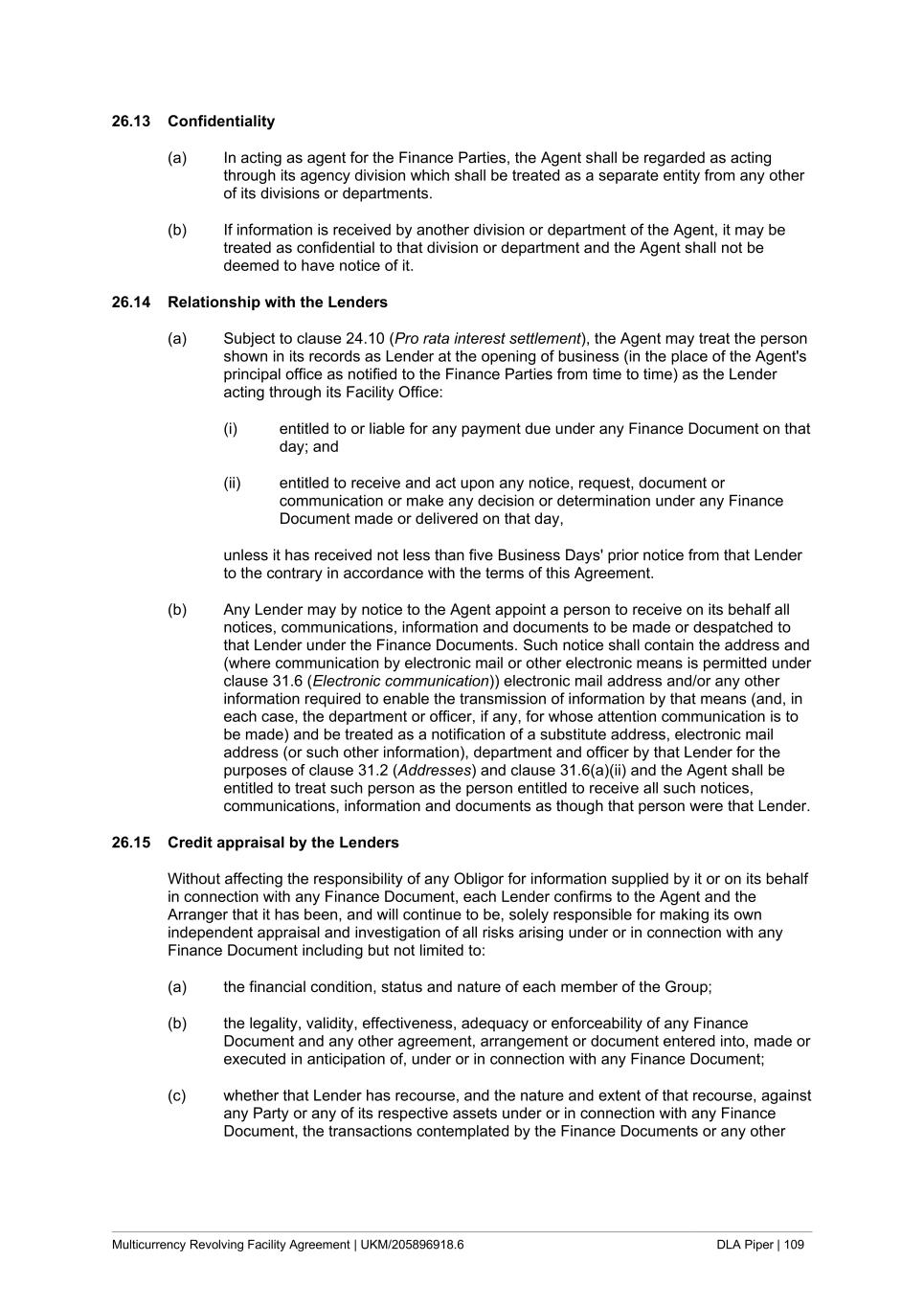 Multicurrency Revolving Facility Agreement | UKM/205896918.6 DLA Piper | 109 26.13 Confidentiality (a) In acting as agent for the Finance Parties, the Agent shall be regarded as acting through its agency division which shall be treated as a separate entity from any other of its divisions or departments. (b) If information is received by another division or department of the Agent, it may be treated as confidential to that division or department and the Agent shall not be deemed to have notice of it. 26.14 Relationship with the Lenders (a) Subject to clause 24.10 (Pro rata interest settlement), the Agent may treat the person shown in its records as Lender at the opening of business (in the place of the Agent's principal office as notified to the Finance Parties from time to time) as the Lender acting through its Facility Office: (i) entitled to or liable for any payment due under any Finance Document on that day; and (ii) entitled to receive and act upon any notice, request, document or communication or make any decision or determination under any Finance Document made or delivered on that day, unless it has received not less than five Business Days' prior notice from that Lender to the contrary in accordance with the terms of this Agreement. (b) Any Lender may by notice to the Agent appoint a person to receive on its behalf all notices, communications, information and documents to be made or despatched to that Lender under the Finance Documents. Such notice shall contain the address and (where communication by electronic mail or other electronic means is permitted under clause 31.6 (Electronic communication)) electronic mail address and/or any other information required to enable the transmission of information by that means (and, in each case, the department or officer, if any, for whose attention communication is to be made) and be treated as a notification of a substitute address, electronic mail address (or such other information), department and officer by that Lender for the purposes of clause 31.2 (Addresses) and clause 31.6(a)(ii) and the Agent shall be entitled to treat such person as the person entitled to receive all such notices, communications, information and documents as though that person were that Lender. 26.15 Credit appraisal by the Lenders Without affecting the responsibility of any Obligor for information supplied by it or on its behalf in connection with any Finance Document, each Lender confirms to the Agent and the Arranger that it has been, and will continue to be, solely responsible for making its own independent appraisal and investigation of all risks arising under or in connection with any Finance Document including but not limited to: (a) the financial condition, status and nature of each member of the Group; (b) the legality, validity, effectiveness, adequacy or enforceability of any Finance Document and any other agreement, arrangement or document entered into, made or executed in anticipation of, under or in connection with any Finance Document; (c) whether that Lender has recourse, and the nature and extent of that recourse, against any Party or any of its respective assets under or in connection with any Finance Document, the transactions contemplated by the Finance Documents or any other