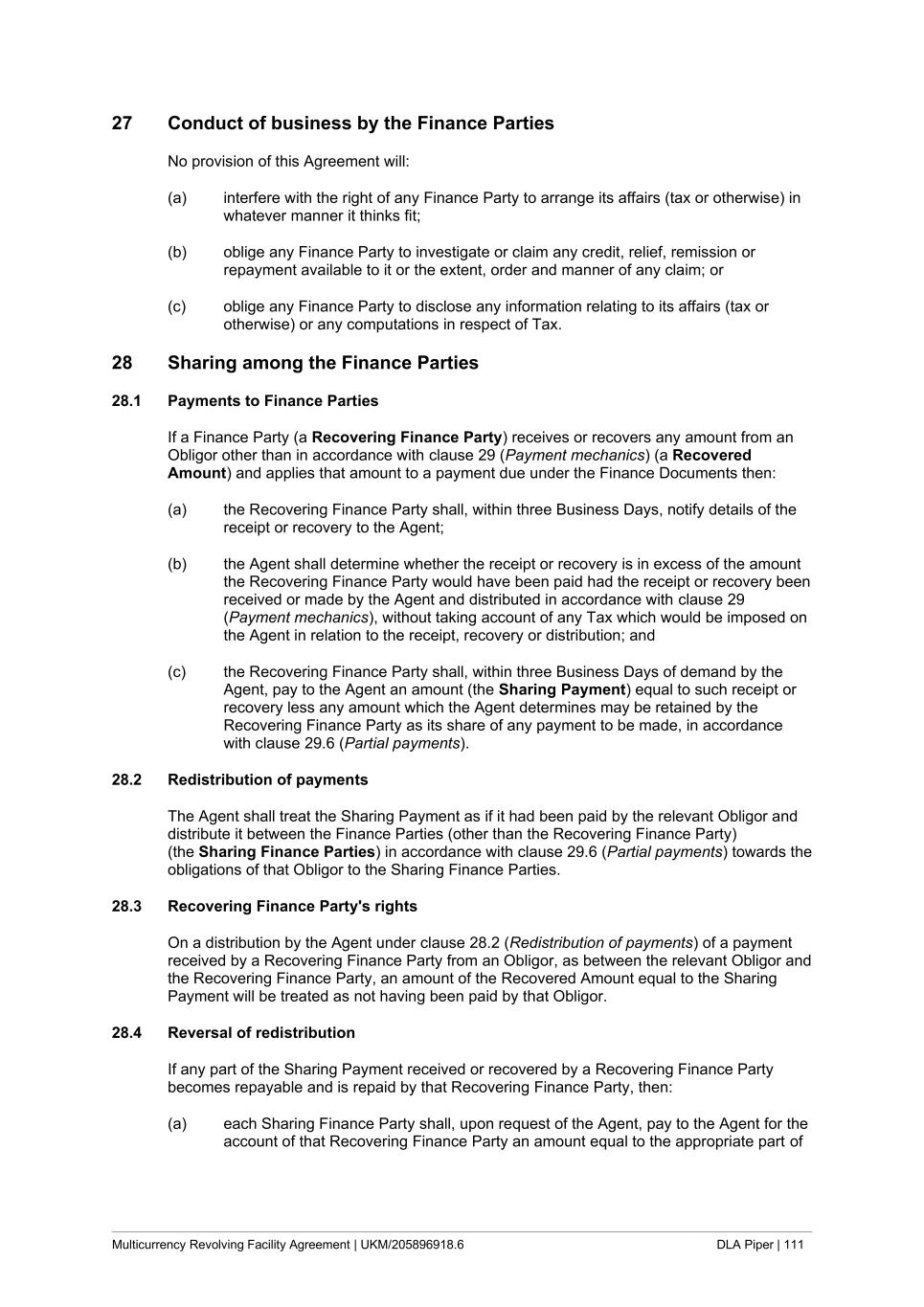 Multicurrency Revolving Facility Agreement | UKM/205896918.6 DLA Piper | 111 27 Conduct of business by the Finance Parties No provision of this Agreement will: (a) interfere with the right of any Finance Party to arrange its affairs (tax or otherwise) in whatever manner it thinks fit; (b) oblige any Finance Party to investigate or claim any credit, relief, remission or repayment available to it or the extent, order and manner of any claim; or (c) oblige any Finance Party to disclose any information relating to its affairs (tax or otherwise) or any computations in respect of Tax. 28 Sharing among the Finance Parties 28.1 Payments to Finance Parties If a Finance Party (a Recovering Finance Party) receives or recovers any amount from an Obligor other than in accordance with clause 29 (Payment mechanics) (a Recovered Amount) and applies that amount to a payment due under the Finance Documents then: (a) the Recovering Finance Party shall, within three Business Days, notify details of the receipt or recovery to the Agent; (b) the Agent shall determine whether the receipt or recovery is in excess of the amount the Recovering Finance Party would have been paid had the receipt or recovery been received or made by the Agent and distributed in accordance with clause 29 (Payment mechanics), without taking account of any Tax which would be imposed on the Agent in relation to the receipt, recovery or distribution; and (c) the Recovering Finance Party shall, within three Business Days of demand by the Agent, pay to the Agent an amount (the Sharing Payment) equal to such receipt or recovery less any amount which the Agent determines may be retained by the Recovering Finance Party as its share of any payment to be made, in accordance with clause 29.6 (Partial payments). 28.2 Redistribution of payments The Agent shall treat the Sharing Payment as if it had been paid by the relevant Obligor and distribute it between the Finance Parties (other than the Recovering Finance Party) (the Sharing Finance Parties) in accordance with clause 29.6 (Partial payments) towards the obligations of that Obligor to the Sharing Finance Parties. 28.3 Recovering Finance Party's rights On a distribution by the Agent under clause 28.2 (Redistribution of payments) of a payment received by a Recovering Finance Party from an Obligor, as between the relevant Obligor and the Recovering Finance Party, an amount of the Recovered Amount equal to the Sharing Payment will be treated as not having been paid by that Obligor. 28.4 Reversal of redistribution If any part of the Sharing Payment received or recovered by a Recovering Finance Party becomes repayable and is repaid by that Recovering Finance Party, then: (a) each Sharing Finance Party shall, upon request of the Agent, pay to the Agent for the account of that Recovering Finance Party an amount equal to the appropriate part of
