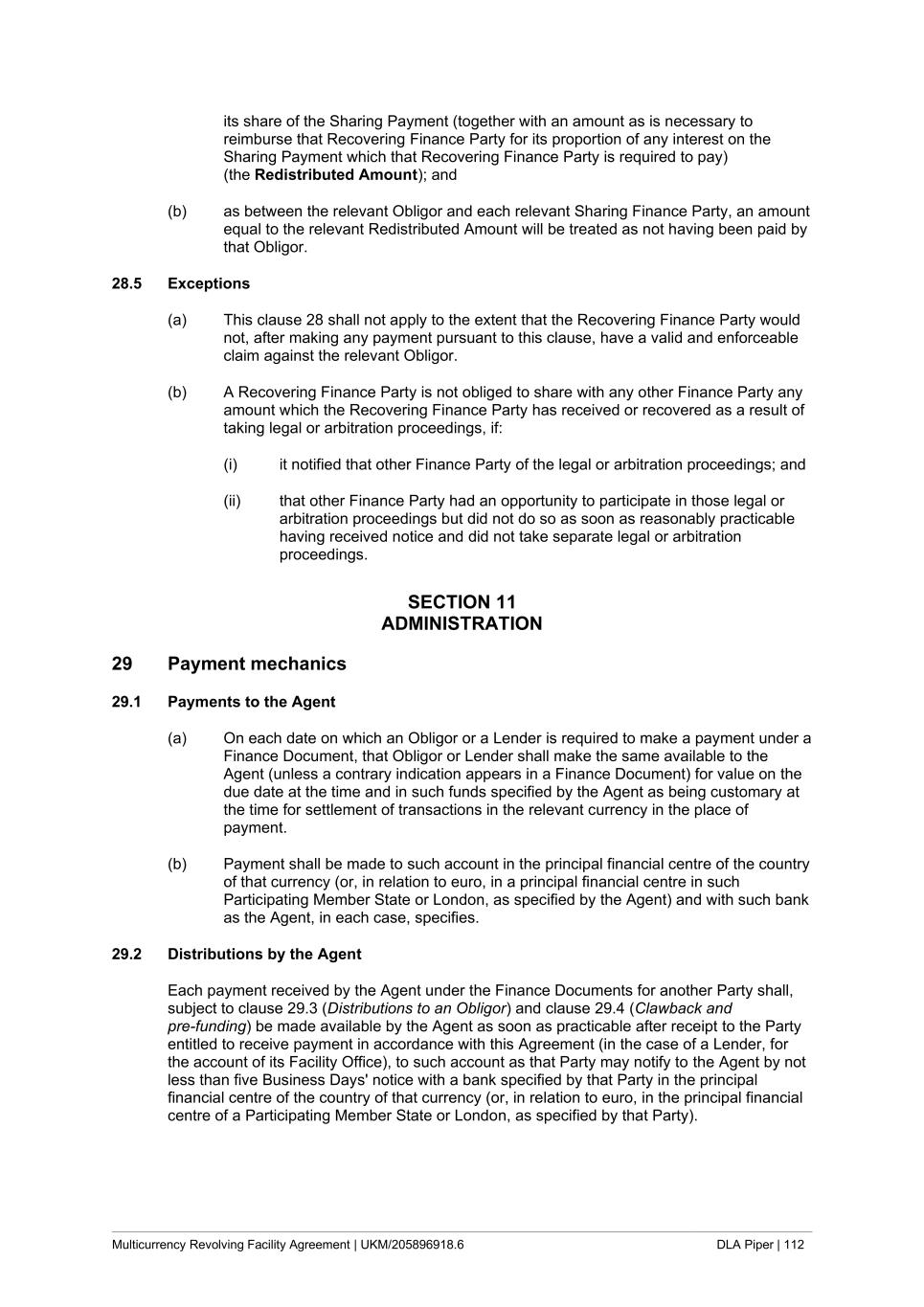 Multicurrency Revolving Facility Agreement | UKM/205896918.6 DLA Piper | 112 its share of the Sharing Payment (together with an amount as is necessary to reimburse that Recovering Finance Party for its proportion of any interest on the Sharing Payment which that Recovering Finance Party is required to pay) (the Redistributed Amount); and (b) as between the relevant Obligor and each relevant Sharing Finance Party, an amount equal to the relevant Redistributed Amount will be treated as not having been paid by that Obligor. 28.5 Exceptions (a) This clause 28 shall not apply to the extent that the Recovering Finance Party would not, after making any payment pursuant to this clause, have a valid and enforceable claim against the relevant Obligor. (b) A Recovering Finance Party is not obliged to share with any other Finance Party any amount which the Recovering Finance Party has received or recovered as a result of taking legal or arbitration proceedings, if: (i) it notified that other Finance Party of the legal or arbitration proceedings; and (ii) that other Finance Party had an opportunity to participate in those legal or arbitration proceedings but did not do so as soon as reasonably practicable having received notice and did not take separate legal or arbitration proceedings. SECTION 11 ADMINISTRATION 29 Payment mechanics 29.1 Payments to the Agent (a) On each date on which an Obligor or a Lender is required to make a payment under a Finance Document, that Obligor or Lender shall make the same available to the Agent (unless a contrary indication appears in a Finance Document) for value on the due date at the time and in such funds specified by the Agent as being customary at the time for settlement of transactions in the relevant currency in the place of payment. (b) Payment shall be made to such account in the principal financial centre of the country of that currency (or, in relation to euro, in a principal financial centre in such Participating Member State or London, as specified by the Agent) and with such bank as the Agent, in each case, specifies. 29.2 Distributions by the Agent Each payment received by the Agent under the Finance Documents for another Party shall, subject to clause 29.3 (Distributions to an Obligor) and clause 29.4 (Clawback and pre-funding) be made available by the Agent as soon as practicable after receipt to the Party entitled to receive payment in accordance with this Agreement (in the case of a Lender, for the account of its Facility Office), to such account as that Party may notify to the Agent by not less than five Business Days' notice with a bank specified by that Party in the principal financial centre of the country of that currency (or, in relation to euro, in the principal financial centre of a Participating Member State or London, as specified by that Party).