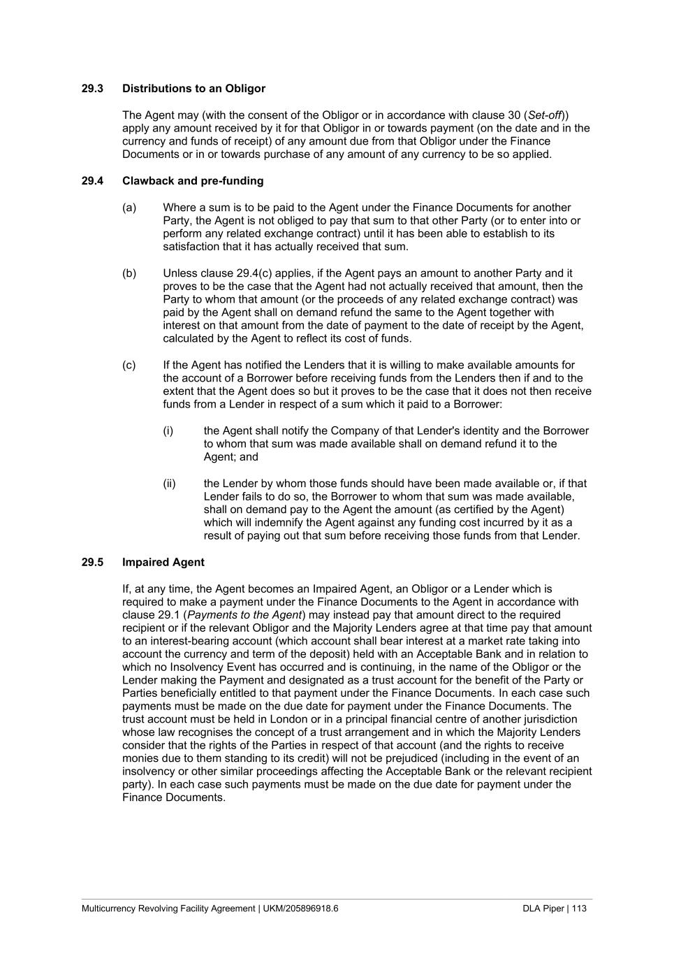 Multicurrency Revolving Facility Agreement | UKM/205896918.6 DLA Piper | 113 29.3 Distributions to an Obligor The Agent may (with the consent of the Obligor or in accordance with clause 30 (Set-off)) apply any amount received by it for that Obligor in or towards payment (on the date and in the currency and funds of receipt) of any amount due from that Obligor under the Finance Documents or in or towards purchase of any amount of any currency to be so applied. 29.4 Clawback and pre-funding (a) Where a sum is to be paid to the Agent under the Finance Documents for another Party, the Agent is not obliged to pay that sum to that other Party (or to enter into or perform any related exchange contract) until it has been able to establish to its satisfaction that it has actually received that sum. (b) Unless clause 29.4(c) applies, if the Agent pays an amount to another Party and it proves to be the case that the Agent had not actually received that amount, then the Party to whom that amount (or the proceeds of any related exchange contract) was paid by the Agent shall on demand refund the same to the Agent together with interest on that amount from the date of payment to the date of receipt by the Agent, calculated by the Agent to reflect its cost of funds. (c) If the Agent has notified the Lenders that it is willing to make available amounts for the account of a Borrower before receiving funds from the Lenders then if and to the extent that the Agent does so but it proves to be the case that it does not then receive funds from a Lender in respect of a sum which it paid to a Borrower: (i) the Agent shall notify the Company of that Lender's identity and the Borrower to whom that sum was made available shall on demand refund it to the Agent; and (ii) the Lender by whom those funds should have been made available or, if that Lender fails to do so, the Borrower to whom that sum was made available, shall on demand pay to the Agent the amount (as certified by the Agent) which will indemnify the Agent against any funding cost incurred by it as a result of paying out that sum before receiving those funds from that Lender. 29.5 Impaired Agent If, at any time, the Agent becomes an Impaired Agent, an Obligor or a Lender which is required to make a payment under the Finance Documents to the Agent in accordance with clause 29.1 (Payments to the Agent) may instead pay that amount direct to the required recipient or if the relevant Obligor and the Majority Lenders agree at that time pay that amount to an interest-bearing account (which account shall bear interest at a market rate taking into account the currency and term of the deposit) held with an Acceptable Bank and in relation to which no Insolvency Event has occurred and is continuing, in the name of the Obligor or the Lender making the Payment and designated as a trust account for the benefit of the Party or Parties beneficially entitled to that payment under the Finance Documents. In each case such payments must be made on the due date for payment under the Finance Documents. The trust account must be held in London or in a principal financial centre of another jurisdiction whose law recognises the concept of a trust arrangement and in which the Majority Lenders consider that the rights of the Parties in respect of that account (and the rights to receive monies due to them standing to its credit) will not be prejudiced (including in the event of an insolvency or other similar proceedings affecting the Acceptable Bank or the relevant recipient party). In each case such payments must be made on the due date for payment under the Finance Documents.