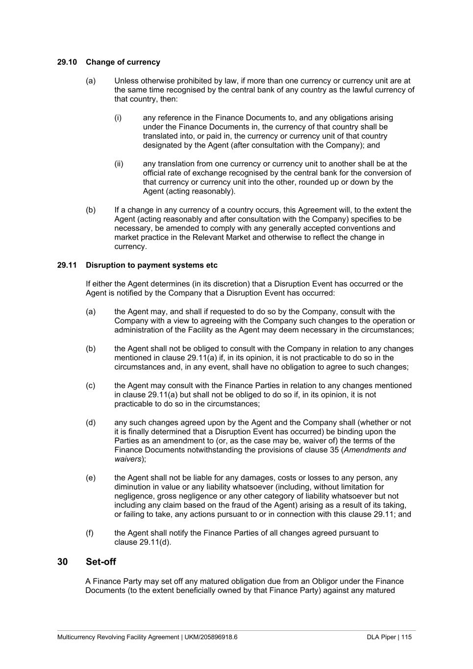 Multicurrency Revolving Facility Agreement | UKM/205896918.6 DLA Piper | 115 29.10 Change of currency (a) Unless otherwise prohibited by law, if more than one currency or currency unit are at the same time recognised by the central bank of any country as the lawful currency of that country, then: (i) any reference in the Finance Documents to, and any obligations arising under the Finance Documents in, the currency of that country shall be translated into, or paid in, the currency or currency unit of that country designated by the Agent (after consultation with the Company); and (ii) any translation from one currency or currency unit to another shall be at the official rate of exchange recognised by the central bank for the conversion of that currency or currency unit into the other, rounded up or down by the Agent (acting reasonably). (b) If a change in any currency of a country occurs, this Agreement will, to the extent the Agent (acting reasonably and after consultation with the Company) specifies to be necessary, be amended to comply with any generally accepted conventions and market practice in the Relevant Market and otherwise to reflect the change in currency. 29.11 Disruption to payment systems etc If either the Agent determines (in its discretion) that a Disruption Event has occurred or the Agent is notified by the Company that a Disruption Event has occurred: (a) the Agent may, and shall if requested to do so by the Company, consult with the Company with a view to agreeing with the Company such changes to the operation or administration of the Facility as the Agent may deem necessary in the circumstances; (b) the Agent shall not be obliged to consult with the Company in relation to any changes mentioned in clause 29.11(a) if, in its opinion, it is not practicable to do so in the circumstances and, in any event, shall have no obligation to agree to such changes; (c) the Agent may consult with the Finance Parties in relation to any changes mentioned in clause 29.11(a) but shall not be obliged to do so if, in its opinion, it is not practicable to do so in the circumstances; (d) any such changes agreed upon by the Agent and the Company shall (whether or not it is finally determined that a Disruption Event has occurred) be binding upon the Parties as an amendment to (or, as the case may be, waiver of) the terms of the Finance Documents notwithstanding the provisions of clause 35 (Amendments and waivers); (e) the Agent shall not be liable for any damages, costs or losses to any person, any diminution in value or any liability whatsoever (including, without limitation for negligence, gross negligence or any other category of liability whatsoever but not including any claim based on the fraud of the Agent) arising as a result of its taking, or failing to take, any actions pursuant to or in connection with this clause 29.11; and (f) the Agent shall notify the Finance Parties of all changes agreed pursuant to clause 29.11(d). 30 Set-off A Finance Party may set off any matured obligation due from an Obligor under the Finance Documents (to the extent beneficially owned by that Finance Party) against any matured