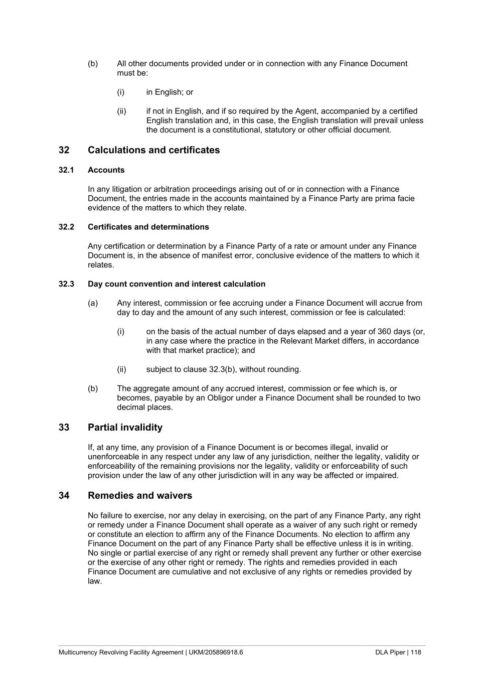 Multicurrency Revolving Facility Agreement | UKM/205896918.6 DLA Piper | 118 (b) All other documents provided under or in connection with any Finance Document must be: (i) in English; or (ii) if not in English, and if so required by the Agent, accompanied by a certified English translation and, in this case, the English translation will prevail unless the document is a constitutional, statutory or other official document. 32 Calculations and certificates 32.1 Accounts In any litigation or arbitration proceedings arising out of or in connection with a Finance Document, the entries made in the accounts maintained by a Finance Party are prima facie evidence of the matters to which they relate. 32.2 Certificates and determinations Any certification or determination by a Finance Party of a rate or amount under any Finance Document is, in the absence of manifest error, conclusive evidence of the matters to which it relates. 32.3 Day count convention and interest calculation (a) Any interest, commission or fee accruing under a Finance Document will accrue from day to day and the amount of any such interest, commission or fee is calculated: (i) on the basis of the actual number of days elapsed and a year of 360 days (or, in any case where the practice in the Relevant Market differs, in accordance with that market practice); and (ii) subject to clause 32.3(b), without rounding. (b) The aggregate amount of any accrued interest, commission or fee which is, or becomes, payable by an Obligor under a Finance Document shall be rounded to two decimal places. 33 Partial invalidity If, at any time, any provision of a Finance Document is or becomes illegal, invalid or unenforceable in any respect under any law of any jurisdiction, neither the legality, validity or enforceability of the remaining provisions nor the legality, validity or enforceability of such provision under the law of any other jurisdiction will in any way be affected or impaired. 34 Remedies and waivers No failure to exercise, nor any delay in exercising, on the part of any Finance Party, any right or remedy under a Finance Document shall operate as a waiver of any such right or remedy or constitute an election to affirm any of the Finance Documents. No election to affirm any Finance Document on the part of any Finance Party shall be effective unless it is in writing. No single or partial exercise of any right or remedy shall prevent any further or other exercise or the exercise of any other right or remedy. The rights and remedies provided in each Finance Document are cumulative and not exclusive of any rights or remedies provided by law.