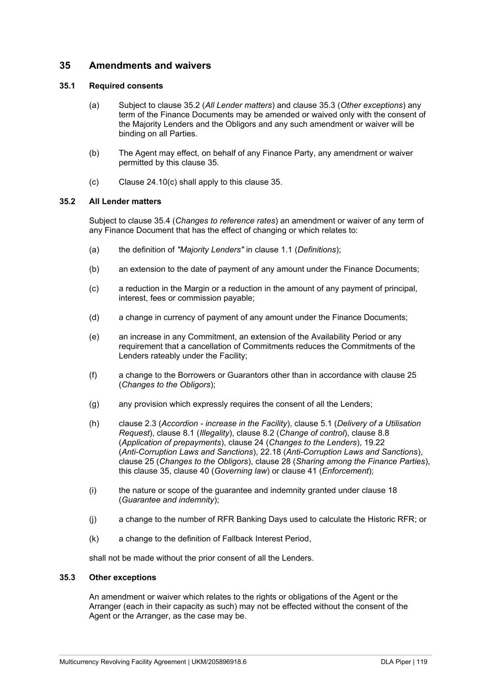 Multicurrency Revolving Facility Agreement | UKM/205896918.6 DLA Piper | 119 35 Amendments and waivers 35.1 Required consents (a) Subject to clause 35.2 (All Lender matters) and clause 35.3 (Other exceptions) any term of the Finance Documents may be amended or waived only with the consent of the Majority Lenders and the Obligors and any such amendment or waiver will be binding on all Parties. (b) The Agent may effect, on behalf of any Finance Party, any amendment or waiver permitted by this clause 35. (c) Clause 24.10(c) shall apply to this clause 35. 35.2 All Lender matters Subject to clause 35.4 (Changes to reference rates) an amendment or waiver of any term of any Finance Document that has the effect of changing or which relates to: (a) the definition of "Majority Lenders" in clause 1.1 (Definitions); (b) an extension to the date of payment of any amount under the Finance Documents; (c) a reduction in the Margin or a reduction in the amount of any payment of principal, interest, fees or commission payable; (d) a change in currency of payment of any amount under the Finance Documents; (e) an increase in any Commitment, an extension of the Availability Period or any requirement that a cancellation of Commitments reduces the Commitments of the Lenders rateably under the Facility; (f) a change to the Borrowers or Guarantors other than in accordance with clause 25 (Changes to the Obligors); (g) any provision which expressly requires the consent of all the Lenders; (h) clause 2.3 (Accordion - increase in the Facility), clause 5.1 (Delivery of a Utilisation Request), clause 8.1 (Illegality), clause 8.2 (Change of control), clause 8.8 (Application of prepayments), clause 24 (Changes to the Lenders), 19.22 (Anti-Corruption Laws and Sanctions), 22.18 (Anti-Corruption Laws and Sanctions), clause 25 (Changes to the Obligors), clause 28 (Sharing among the Finance Parties), this clause 35, clause 40 (Governing law) or clause 41 (Enforcement); (i) the nature or scope of the guarantee and indemnity granted under clause 18 (Guarantee and indemnity); (j) a change to the number of RFR Banking Days used to calculate the Historic RFR; or (k) a change to the definition of Fallback Interest Period, shall not be made without the prior consent of all the Lenders. 35.3 Other exceptions An amendment or waiver which relates to the rights or obligations of the Agent or the Arranger (each in their capacity as such) may not be effected without the consent of the Agent or the Arranger, as the case may be.