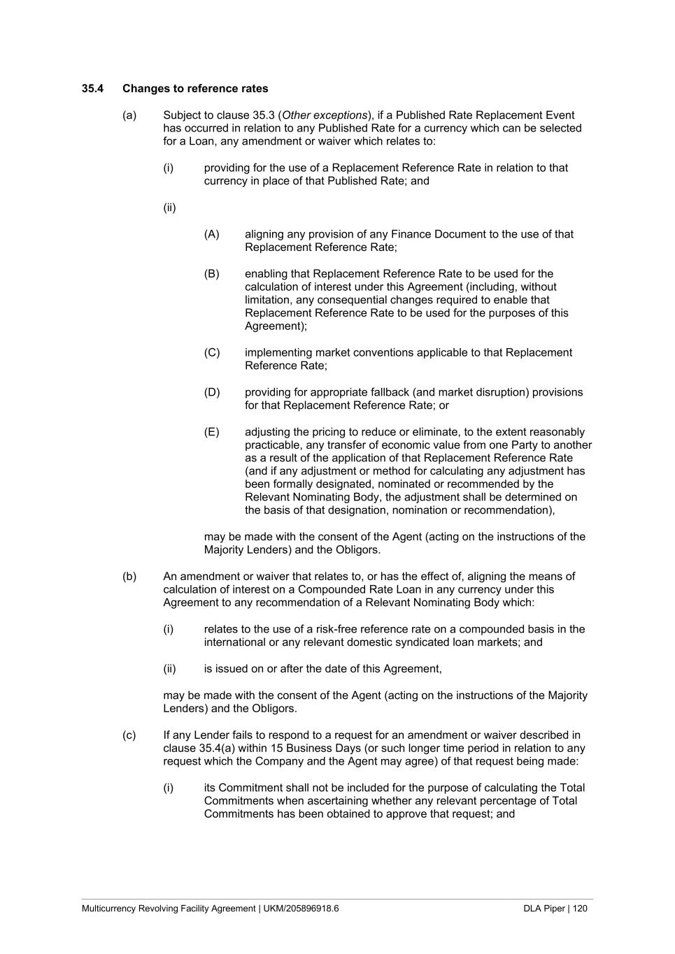 Multicurrency Revolving Facility Agreement | UKM/205896918.6 DLA Piper | 120 35.4 Changes to reference rates (a) Subject to clause 35.3 (Other exceptions), if a Published Rate Replacement Event has occurred in relation to any Published Rate for a currency which can be selected for a Loan, any amendment or waiver which relates to: (i) providing for the use of a Replacement Reference Rate in relation to that currency in place of that Published Rate; and (ii) (A) aligning any provision of any Finance Document to the use of that Replacement Reference Rate; (B) enabling that Replacement Reference Rate to be used for the calculation of interest under this Agreement (including, without limitation, any consequential changes required to enable that Replacement Reference Rate to be used for the purposes of this Agreement); (C) implementing market conventions applicable to that Replacement Reference Rate; (D) providing for appropriate fallback (and market disruption) provisions for that Replacement Reference Rate; or (E) adjusting the pricing to reduce or eliminate, to the extent reasonably practicable, any transfer of economic value from one Party to another as a result of the application of that Replacement Reference Rate (and if any adjustment or method for calculating any adjustment has been formally designated, nominated or recommended by the Relevant Nominating Body, the adjustment shall be determined on the basis of that designation, nomination or recommendation), may be made with the consent of the Agent (acting on the instructions of the Majority Lenders) and the Obligors. (b) An amendment or waiver that relates to, or has the effect of, aligning the means of calculation of interest on a Compounded Rate Loan in any currency under this Agreement to any recommendation of a Relevant Nominating Body which: (i) relates to the use of a risk-free reference rate on a compounded basis in the international or any relevant domestic syndicated loan markets; and (ii) is issued on or after the date of this Agreement, may be made with the consent of the Agent (acting on the instructions of the Majority Lenders) and the Obligors. (c) If any Lender fails to respond to a request for an amendment or waiver described in clause 35.4(a) within 15 Business Days (or such longer time period in relation to any request which the Company and the Agent may agree) of that request being made: (i) its Commitment shall not be included for the purpose of calculating the Total Commitments when ascertaining whether any relevant percentage of Total Commitments has been obtained to approve that request; and