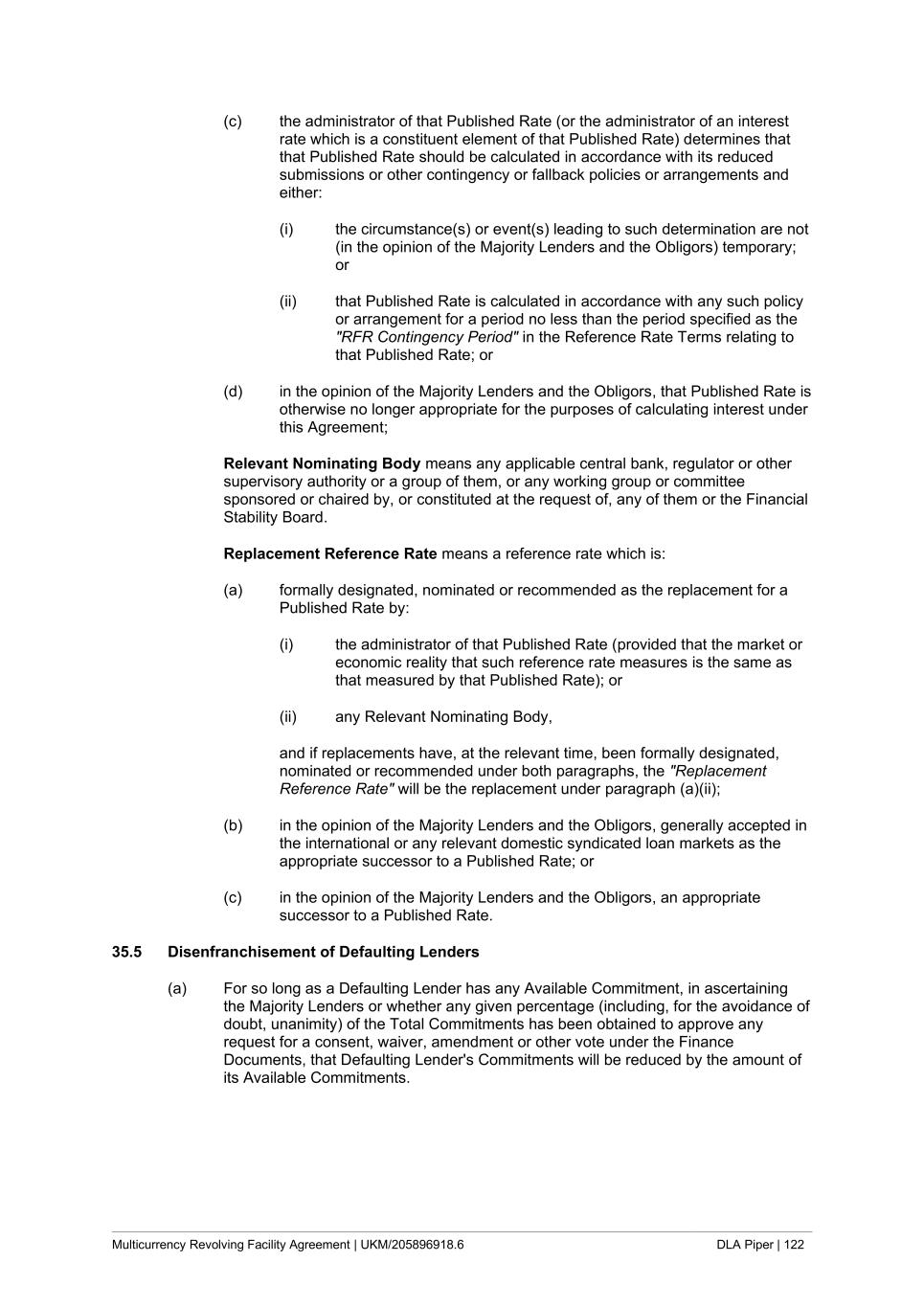 Multicurrency Revolving Facility Agreement | UKM/205896918.6 DLA Piper | 122 (c) the administrator of that Published Rate (or the administrator of an interest rate which is a constituent element of that Published Rate) determines that that Published Rate should be calculated in accordance with its reduced submissions or other contingency or fallback policies or arrangements and either: (i) the circumstance(s) or event(s) leading to such determination are not (in the opinion of the Majority Lenders and the Obligors) temporary; or (ii) that Published Rate is calculated in accordance with any such policy or arrangement for a period no less than the period specified as the "RFR Contingency Period" in the Reference Rate Terms relating to that Published Rate; or (d) in the opinion of the Majority Lenders and the Obligors, that Published Rate is otherwise no longer appropriate for the purposes of calculating interest under this Agreement; Relevant Nominating Body means any applicable central bank, regulator or other supervisory authority or a group of them, or any working group or committee sponsored or chaired by, or constituted at the request of, any of them or the Financial Stability Board. Replacement Reference Rate means a reference rate which is: (a) formally designated, nominated or recommended as the replacement for a Published Rate by: (i) the administrator of that Published Rate (provided that the market or economic reality that such reference rate measures is the same as that measured by that Published Rate); or (ii) any Relevant Nominating Body, and if replacements have, at the relevant time, been formally designated, nominated or recommended under both paragraphs, the "Replacement Reference Rate" will be the replacement under paragraph (a)(ii); (b) in the opinion of the Majority Lenders and the Obligors, generally accepted in the international or any relevant domestic syndicated loan markets as the appropriate successor to a Published Rate; or (c) in the opinion of the Majority Lenders and the Obligors, an appropriate successor to a Published Rate. 35.5 Disenfranchisement of Defaulting Lenders (a) For so long as a Defaulting Lender has any Available Commitment, in ascertaining the Majority Lenders or whether any given percentage (including, for the avoidance of doubt, unanimity) of the Total Commitments has been obtained to approve any request for a consent, waiver, amendment or other vote under the Finance Documents, that Defaulting Lender's Commitments will be reduced by the amount of its Available Commitments.
