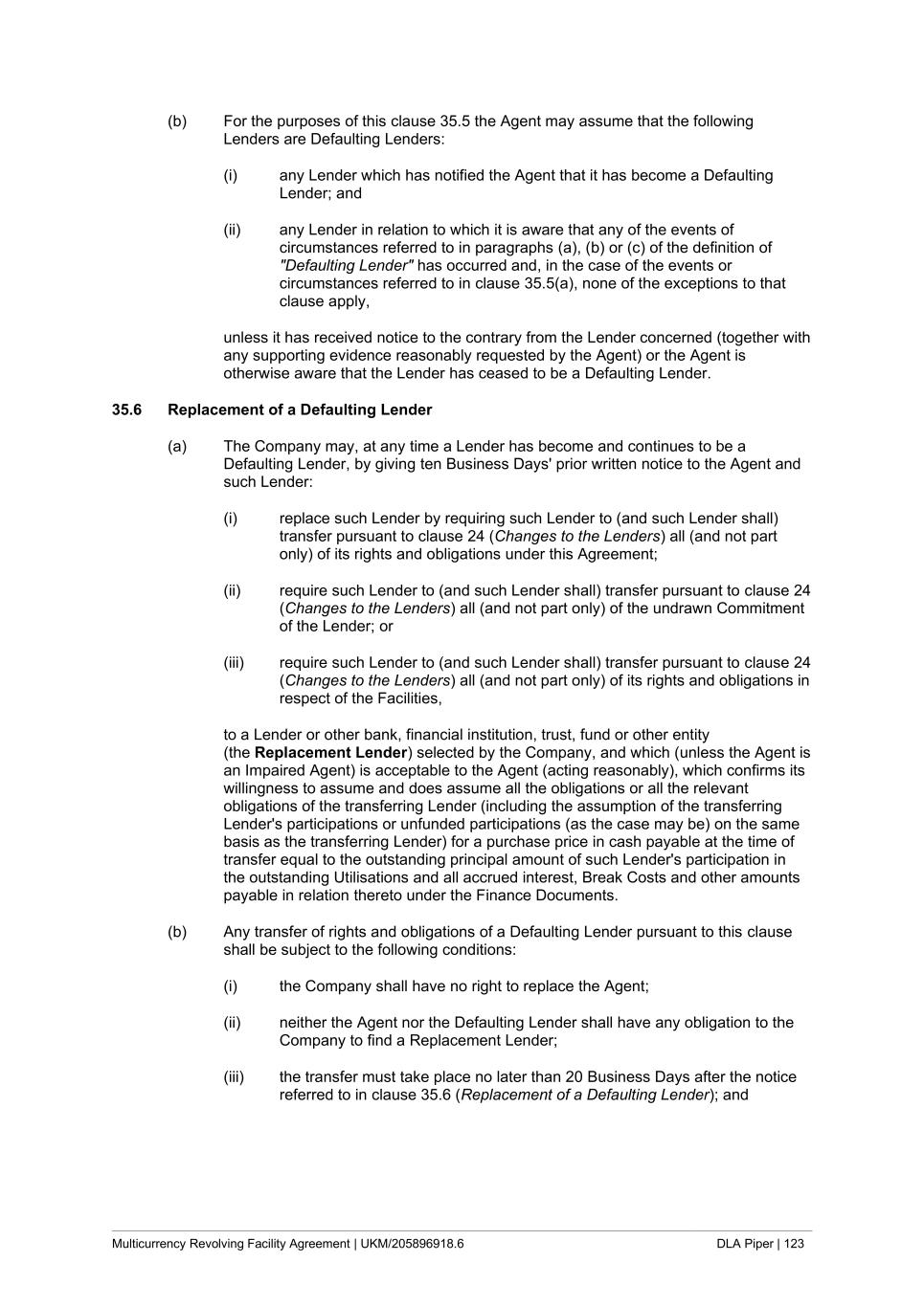 Multicurrency Revolving Facility Agreement | UKM/205896918.6 DLA Piper | 123 (b) For the purposes of this clause 35.5 the Agent may assume that the following Lenders are Defaulting Lenders: (i) any Lender which has notified the Agent that it has become a Defaulting Lender; and (ii) any Lender in relation to which it is aware that any of the events of circumstances referred to in paragraphs (a), (b) or (c) of the definition of "Defaulting Lender" has occurred and, in the case of the events or circumstances referred to in clause 35.5(a), none of the exceptions to that clause apply, unless it has received notice to the contrary from the Lender concerned (together with any supporting evidence reasonably requested by the Agent) or the Agent is otherwise aware that the Lender has ceased to be a Defaulting Lender. 35.6 Replacement of a Defaulting Lender (a) The Company may, at any time a Lender has become and continues to be a Defaulting Lender, by giving ten Business Days' prior written notice to the Agent and such Lender: (i) replace such Lender by requiring such Lender to (and such Lender shall) transfer pursuant to clause 24 (Changes to the Lenders) all (and not part only) of its rights and obligations under this Agreement; (ii) require such Lender to (and such Lender shall) transfer pursuant to clause 24 (Changes to the Lenders) all (and not part only) of the undrawn Commitment of the Lender; or (iii) require such Lender to (and such Lender shall) transfer pursuant to clause 24 (Changes to the Lenders) all (and not part only) of its rights and obligations in respect of the Facilities, to a Lender or other bank, financial institution, trust, fund or other entity (the Replacement Lender) selected by the Company, and which (unless the Agent is an Impaired Agent) is acceptable to the Agent (acting reasonably), which confirms its willingness to assume and does assume all the obligations or all the relevant obligations of the transferring Lender (including the assumption of the transferring Lender's participations or unfunded participations (as the case may be) on the same basis as the transferring Lender) for a purchase price in cash payable at the time of transfer equal to the outstanding principal amount of such Lender's participation in the outstanding Utilisations and all accrued interest, Break Costs and other amounts payable in relation thereto under the Finance Documents. (b) Any transfer of rights and obligations of a Defaulting Lender pursuant to this clause shall be subject to the following conditions: (i) the Company shall have no right to replace the Agent; (ii) neither the Agent nor the Defaulting Lender shall have any obligation to the Company to find a Replacement Lender; (iii) the transfer must take place no later than 20 Business Days after the notice referred to in clause 35.6 (Replacement of a Defaulting Lender); and