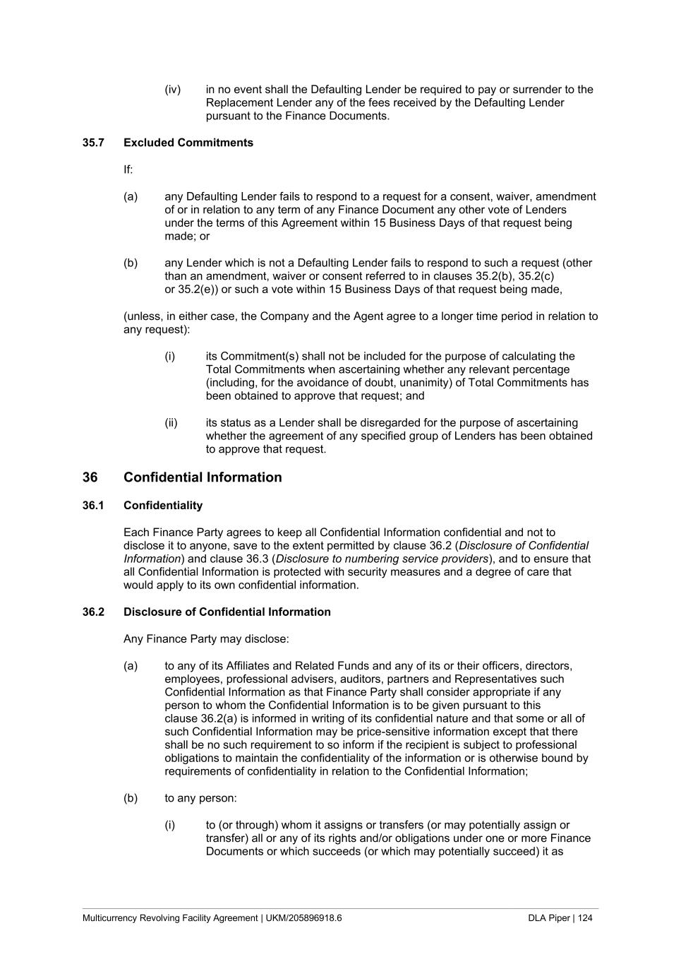Multicurrency Revolving Facility Agreement | UKM/205896918.6 DLA Piper | 124 (iv) in no event shall the Defaulting Lender be required to pay or surrender to the Replacement Lender any of the fees received by the Defaulting Lender pursuant to the Finance Documents. 35.7 Excluded Commitments If: (a) any Defaulting Lender fails to respond to a request for a consent, waiver, amendment of or in relation to any term of any Finance Document any other vote of Lenders under the terms of this Agreement within 15 Business Days of that request being made; or (b) any Lender which is not a Defaulting Lender fails to respond to such a request (other than an amendment, waiver or consent referred to in clauses 35.2(b), 35.2(c) or 35.2(e)) or such a vote within 15 Business Days of that request being made, (unless, in either case, the Company and the Agent agree to a longer time period in relation to any request): (i) its Commitment(s) shall not be included for the purpose of calculating the Total Commitments when ascertaining whether any relevant percentage (including, for the avoidance of doubt, unanimity) of Total Commitments has been obtained to approve that request; and (ii) its status as a Lender shall be disregarded for the purpose of ascertaining whether the agreement of any specified group of Lenders has been obtained to approve that request. 36 Confidential Information 36.1 Confidentiality Each Finance Party agrees to keep all Confidential Information confidential and not to disclose it to anyone, save to the extent permitted by clause 36.2 (Disclosure of Confidential Information) and clause 36.3 (Disclosure to numbering service providers), and to ensure that all Confidential Information is protected with security measures and a degree of care that would apply to its own confidential information. 36.2 Disclosure of Confidential Information Any Finance Party may disclose: (a) to any of its Affiliates and Related Funds and any of its or their officers, directors, employees, professional advisers, auditors, partners and Representatives such Confidential Information as that Finance Party shall consider appropriate if any person to whom the Confidential Information is to be given pursuant to this clause 36.2(a) is informed in writing of its confidential nature and that some or all of such Confidential Information may be price-sensitive information except that there shall be no such requirement to so inform if the recipient is subject to professional obligations to maintain the confidentiality of the information or is otherwise bound by requirements of confidentiality in relation to the Confidential Information; (b) to any person: (i) to (or through) whom it assigns or transfers (or may potentially assign or transfer) all or any of its rights and/or obligations under one or more Finance Documents or which succeeds (or which may potentially succeed) it as