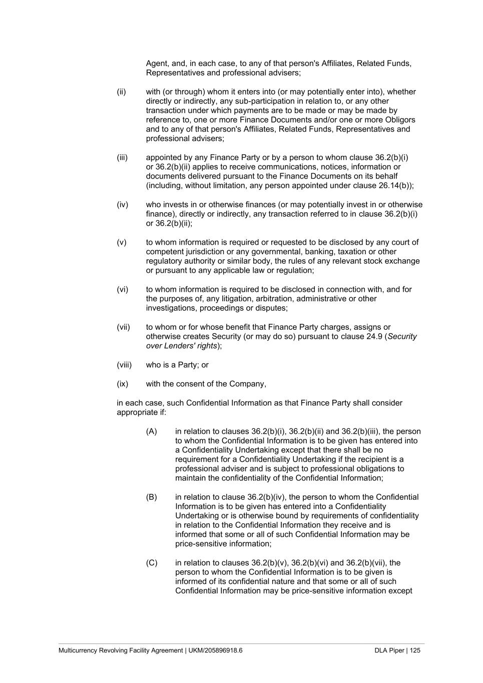 Multicurrency Revolving Facility Agreement | UKM/205896918.6 DLA Piper | 125 Agent, and, in each case, to any of that person's Affiliates, Related Funds, Representatives and professional advisers; (ii) with (or through) whom it enters into (or may potentially enter into), whether directly or indirectly, any sub-participation in relation to, or any other transaction under which payments are to be made or may be made by reference to, one or more Finance Documents and/or one or more Obligors and to any of that person's Affiliates, Related Funds, Representatives and professional advisers; (iii) appointed by any Finance Party or by a person to whom clause 36.2(b)(i) or 36.2(b)(ii) applies to receive communications, notices, information or documents delivered pursuant to the Finance Documents on its behalf (including, without limitation, any person appointed under clause 26.14(b)); (iv) who invests in or otherwise finances (or may potentially invest in or otherwise finance), directly or indirectly, any transaction referred to in clause 36.2(b)(i) or 36.2(b)(ii); (v) to whom information is required or requested to be disclosed by any court of competent jurisdiction or any governmental, banking, taxation or other regulatory authority or similar body, the rules of any relevant stock exchange or pursuant to any applicable law or regulation; (vi) to whom information is required to be disclosed in connection with, and for the purposes of, any litigation, arbitration, administrative or other investigations, proceedings or disputes; (vii) to whom or for whose benefit that Finance Party charges, assigns or otherwise creates Security (or may do so) pursuant to clause 24.9 (Security over Lenders' rights); (viii) who is a Party; or (ix) with the consent of the Company, in each case, such Confidential Information as that Finance Party shall consider appropriate if: (A) in relation to clauses 36.2(b)(i), 36.2(b)(ii) and 36.2(b)(iii), the person to whom the Confidential Information is to be given has entered into a Confidentiality Undertaking except that there shall be no requirement for a Confidentiality Undertaking if the recipient is a professional adviser and is subject to professional obligations to maintain the confidentiality of the Confidential Information; (B) in relation to clause 36.2(b)(iv), the person to whom the Confidential Information is to be given has entered into a Confidentiality Undertaking or is otherwise bound by requirements of confidentiality in relation to the Confidential Information they receive and is informed that some or all of such Confidential Information may be price-sensitive information; (C) in relation to clauses 36.2(b)(v), 36.2(b)(vi) and 36.2(b)(vii), the person to whom the Confidential Information is to be given is informed of its confidential nature and that some or all of such Confidential Information may be price-sensitive information except