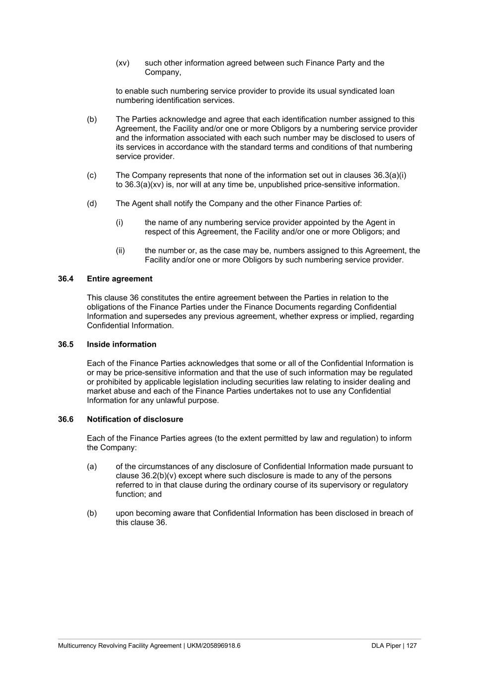 Multicurrency Revolving Facility Agreement | UKM/205896918.6 DLA Piper | 127 (xv) such other information agreed between such Finance Party and the Company, to enable such numbering service provider to provide its usual syndicated loan numbering identification services. (b) The Parties acknowledge and agree that each identification number assigned to this Agreement, the Facility and/or one or more Obligors by a numbering service provider and the information associated with each such number may be disclosed to users of its services in accordance with the standard terms and conditions of that numbering service provider. (c) The Company represents that none of the information set out in clauses 36.3(a)(i) to 36.3(a)(xv) is, nor will at any time be, unpublished price-sensitive information. (d) The Agent shall notify the Company and the other Finance Parties of: (i) the name of any numbering service provider appointed by the Agent in respect of this Agreement, the Facility and/or one or more Obligors; and (ii) the number or, as the case may be, numbers assigned to this Agreement, the Facility and/or one or more Obligors by such numbering service provider. 36.4 Entire agreement This clause 36 constitutes the entire agreement between the Parties in relation to the obligations of the Finance Parties under the Finance Documents regarding Confidential Information and supersedes any previous agreement, whether express or implied, regarding Confidential Information. 36.5 Inside information Each of the Finance Parties acknowledges that some or all of the Confidential Information is or may be price-sensitive information and that the use of such information may be regulated or prohibited by applicable legislation including securities law relating to insider dealing and market abuse and each of the Finance Parties undertakes not to use any Confidential Information for any unlawful purpose. 36.6 Notification of disclosure Each of the Finance Parties agrees (to the extent permitted by law and regulation) to inform the Company: (a) of the circumstances of any disclosure of Confidential Information made pursuant to clause 36.2(b)(v) except where such disclosure is made to any of the persons referred to in that clause during the ordinary course of its supervisory or regulatory function; and (b) upon becoming aware that Confidential Information has been disclosed in breach of this clause 36.