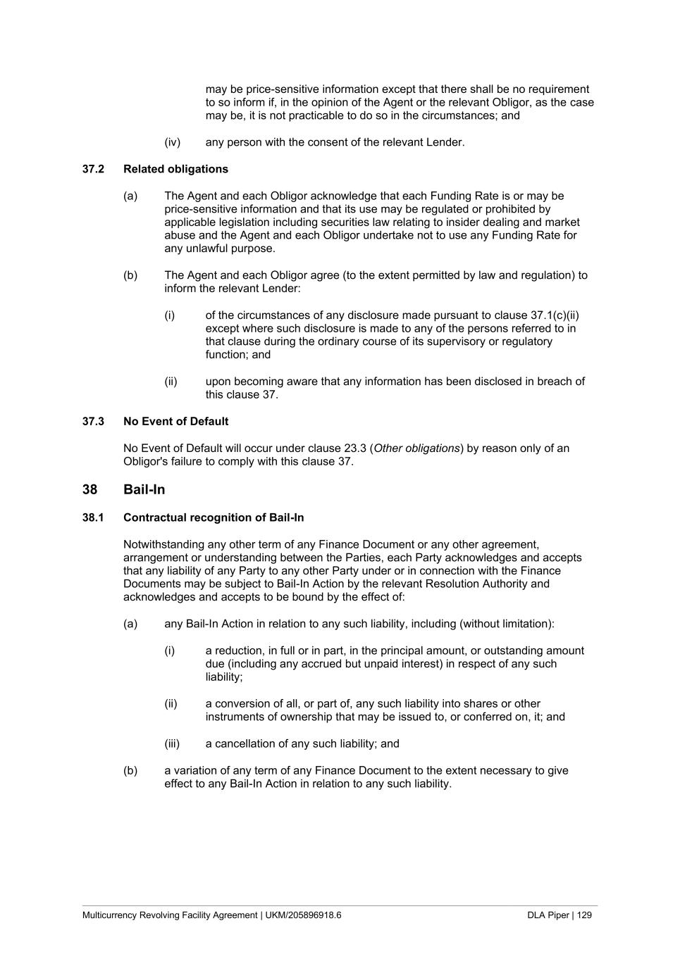 Multicurrency Revolving Facility Agreement | UKM/205896918.6 DLA Piper | 129 may be price-sensitive information except that there shall be no requirement to so inform if, in the opinion of the Agent or the relevant Obligor, as the case may be, it is not practicable to do so in the circumstances; and (iv) any person with the consent of the relevant Lender. 37.2 Related obligations (a) The Agent and each Obligor acknowledge that each Funding Rate is or may be price-sensitive information and that its use may be regulated or prohibited by applicable legislation including securities law relating to insider dealing and market abuse and the Agent and each Obligor undertake not to use any Funding Rate for any unlawful purpose. (b) The Agent and each Obligor agree (to the extent permitted by law and regulation) to inform the relevant Lender: (i) of the circumstances of any disclosure made pursuant to clause 37.1(c)(ii) except where such disclosure is made to any of the persons referred to in that clause during the ordinary course of its supervisory or regulatory function; and (ii) upon becoming aware that any information has been disclosed in breach of this clause 37. 37.3 No Event of Default No Event of Default will occur under clause 23.3 (Other obligations) by reason only of an Obligor's failure to comply with this clause 37. 38 Bail-In 38.1 Contractual recognition of Bail-In Notwithstanding any other term of any Finance Document or any other agreement, arrangement or understanding between the Parties, each Party acknowledges and accepts that any liability of any Party to any other Party under or in connection with the Finance Documents may be subject to Bail-In Action by the relevant Resolution Authority and acknowledges and accepts to be bound by the effect of: (a) any Bail-In Action in relation to any such liability, including (without limitation): (i) a reduction, in full or in part, in the principal amount, or outstanding amount due (including any accrued but unpaid interest) in respect of any such liability; (ii) a conversion of all, or part of, any such liability into shares or other instruments of ownership that may be issued to, or conferred on, it; and (iii) a cancellation of any such liability; and (b) a variation of any term of any Finance Document to the extent necessary to give effect to any Bail-In Action in relation to any such liability.