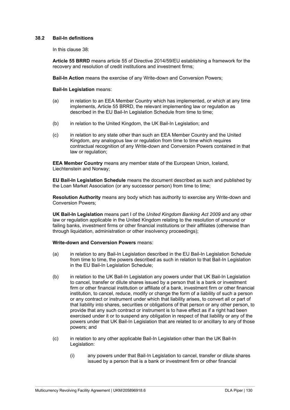 Multicurrency Revolving Facility Agreement | UKM/205896918.6 DLA Piper | 130 38.2 Bail-In definitions In this clause 38: Article 55 BRRD means article 55 of Directive 2014/59/EU establishing a framework for the recovery and resolution of credit institutions and investment firms; Bail-In Action means the exercise of any Write-down and Conversion Powers; Bail-In Legislation means: (a) in relation to an EEA Member Country which has implemented, or which at any time implements, Article 55 BRRD, the relevant implementing law or regulation as described in the EU Bail-In Legislation Schedule from time to time; (b) in relation to the United Kingdom, the UK Bail-In Legislation; and (c) in relation to any state other than such an EEA Member Country and the United Kingdom, any analogous law or regulation from time to time which requires contractual recognition of any Write-down and Conversion Powers contained in that law or regulation; EEA Member Country means any member state of the European Union, Iceland, Liechtenstein and Norway; EU Bail-In Legislation Schedule means the document described as such and published by the Loan Market Association (or any successor person) from time to time; Resolution Authority means any body which has authority to exercise any Write-down and Conversion Powers; UK Bail-In Legislation means part I of the United Kingdom Banking Act 2009 and any other law or regulation applicable in the United Kingdom relating to the resolution of unsound or failing banks, investment firms or other financial institutions or their affiliates (otherwise than through liquidation, administration or other insolvency proceedings); Write-down and Conversion Powers means: (a) in relation to any Bail-In Legislation described in the EU Bail-In Legislation Schedule from time to time, the powers described as such in relation to that Bail-In Legislation in the EU Bail-In Legislation Schedule; (b) in relation to the UK Bail-In Legislation any powers under that UK Bail-In Legislation to cancel, transfer or dilute shares issued by a person that is a bank or investment firm or other financial institution or affiliate of a bank, investment firm or other financial institution, to cancel, reduce, modify or change the form of a liability of such a person or any contract or instrument under which that liability arises, to convert all or part of that liability into shares, securities or obligations of that person or any other person, to provide that any such contract or instrument is to have effect as if a right had been exercised under it or to suspend any obligation in respect of that liability or any of the powers under that UK Bail-In Legislation that are related to or ancillary to any of those powers; and (c) in relation to any other applicable Bail-In Legislation other than the UK Bail-In Legislation: (i) any powers under that Bail-In Legislation to cancel, transfer or dilute shares issued by a person that is a bank or investment firm or other financial