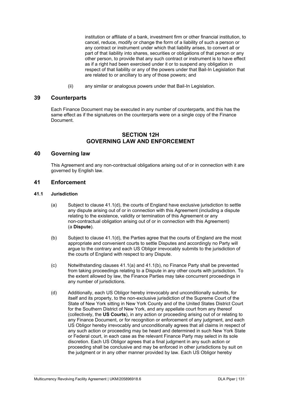 Multicurrency Revolving Facility Agreement | UKM/205896918.6 DLA Piper | 131 institution or affiliate of a bank, investment firm or other financial institution, to cancel, reduce, modify or change the form of a liability of such a person or any contract or instrument under which that liability arises, to convert all or part of that liability into shares, securities or obligations of that person or any other person, to provide that any such contract or instrument is to have effect as if a right had been exercised under it or to suspend any obligation in respect of that liability or any of the powers under that Bail-In Legislation that are related to or ancillary to any of those powers; and (ii) any similar or analogous powers under that Bail-In Legislation. 39 Counterparts Each Finance Document may be executed in any number of counterparts, and this has the same effect as if the signatures on the counterparts were on a single copy of the Finance Document. SECTION 12H GOVERNING LAW AND ENFORCEMENT 40 Governing law This Agreement and any non-contractual obligations arising out of or in connection with it are governed by English law. 41 Enforcement 41.1 Jurisdiction (a) Subject to clause 41.1(d), the courts of England have exclusive jurisdiction to settle any dispute arising out of or in connection with this Agreement (including a dispute relating to the existence, validity or termination of this Agreement or any non-contractual obligation arising out of or in connection with this Agreement) (a Dispute). (b) Subject to clause 41.1(d), the Parties agree that the courts of England are the most appropriate and convenient courts to settle Disputes and accordingly no Party will argue to the contrary and each US Obligor irrevocably submits to the jurisdiction of the courts of England with respect to any Dispute. (c) Notwithstanding clauses 41.1(a) and 41.1(b), no Finance Party shall be prevented from taking proceedings relating to a Dispute in any other courts with jurisdiction. To the extent allowed by law, the Finance Parties may take concurrent proceedings in any number of jurisdictions. (d) Additionally, each US Obligor hereby irrevocably and unconditionally submits, for itself and its property, to the non-exclusive jurisdiction of the Supreme Court of the State of New York sitting in New York County and of the United States District Court for the Southern District of New York, and any appellate court from any thereof (collectively, the US Courts), in any action or proceeding arising out of or relating to any Finance Document, or for recognition or enforcement of any judgment, and each US Obligor hereby irrevocably and unconditionally agrees that all claims in respect of any such action or proceeding may be heard and determined in such New York State or Federal court, in each case as the relevant Finance Party may select in its sole discretion. Each US Obligor agrees that a final judgment in any such action or proceeding shall be conclusive and may be enforced in other jurisdictions by suit on the judgment or in any other manner provided by law. Each US Obligor hereby