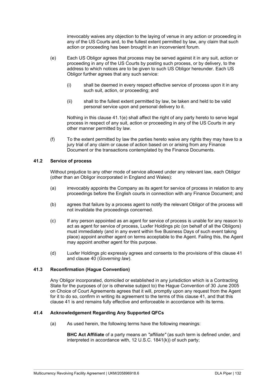 Multicurrency Revolving Facility Agreement | UKM/205896918.6 DLA Piper | 132 irrevocably waives any objection to the laying of venue in any action or proceeding in any of the US Courts and, to the fullest extent permitted by law, any claim that such action or proceeding has been brought in an inconvenient forum. (e) Each US Obligor agrees that process may be served against it in any suit, action or proceeding in any of the US Courts by posting such process, or by delivery, to the address to which notices are to be given to such US Obligor hereunder. Each US Obligor further agrees that any such service: (i) shall be deemed in every respect effective service of process upon it in any such suit, action, or proceeding; and (ii) shall to the fullest extent permitted by law, be taken and held to be valid personal service upon and personal delivery to it. Nothing in this clause 41.1(e) shall affect the right of any party hereto to serve legal process in respect of any suit, action or proceeding in any of the US Courts in any other manner permitted by law. (f) To the extent permitted by law the parties hereto waive any rights they may have to a jury trial of any claim or cause of action based on or arising from any Finance Document or the transactions contemplated by the Finance Documents. 41.2 Service of process Without prejudice to any other mode of service allowed under any relevant law, each Obligor (other than an Obligor incorporated in England and Wales): (a) irrevocably appoints the Company as its agent for service of process in relation to any proceedings before the English courts in connection with any Finance Document; and (b) agrees that failure by a process agent to notify the relevant Obligor of the process will not invalidate the proceedings concerned. (c) If any person appointed as an agent for service of process is unable for any reason to act as agent for service of process, Luxfer Holdings plc (on behalf of all the Obligors) must immediately (and in any event within five Business Days of such event taking place) appoint another agent on terms acceptable to the Agent. Failing this, the Agent may appoint another agent for this purpose. (d) Luxfer Holdings plc expressly agrees and consents to the provisions of this clause 41 and clause 40 (Governing law). 41.3 Reconfirmation (Hague Convention) Any Obligor incorporated, domiciled or established in any jurisdiction which is a Contracting State for the purposes of (or is otherwise subject to) the Hague Convention of 30 June 2005 on Choice of Court Agreements agrees that it will, promptly upon any request from the Agent for it to do so, confirm in writing its agreement to the terms of this clause 41, and that this clause 41 is and remains fully effective and enforceable in accordance with its terms. 41.4 Acknowledgement Regarding Any Supported QFCs (a) As used herein, the following terms have the following meanings: BHC Act Affiliate of a party means an "affiliate" (as such term is defined under, and interpreted in accordance with, 12 U.S.C. 1841(k)) of such party;