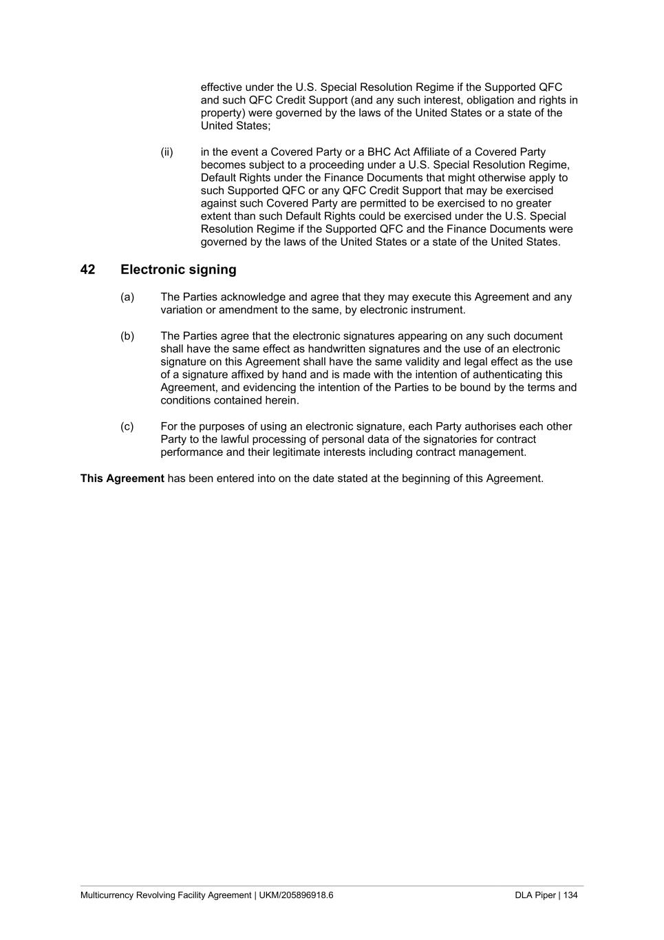 Multicurrency Revolving Facility Agreement | UKM/205896918.6 DLA Piper | 134 effective under the U.S. Special Resolution Regime if the Supported QFC and such QFC Credit Support (and any such interest, obligation and rights in property) were governed by the laws of the United States or a state of the United States; (ii) in the event a Covered Party or a BHC Act Affiliate of a Covered Party becomes subject to a proceeding under a U.S. Special Resolution Regime, Default Rights under the Finance Documents that might otherwise apply to such Supported QFC or any QFC Credit Support that may be exercised against such Covered Party are permitted to be exercised to no greater extent than such Default Rights could be exercised under the U.S. Special Resolution Regime if the Supported QFC and the Finance Documents were governed by the laws of the United States or a state of the United States. 42 Electronic signing (a) The Parties acknowledge and agree that they may execute this Agreement and any variation or amendment to the same, by electronic instrument. (b) The Parties agree that the electronic signatures appearing on any such document shall have the same effect as handwritten signatures and the use of an electronic signature on this Agreement shall have the same validity and legal effect as the use of a signature affixed by hand and is made with the intention of authenticating this Agreement, and evidencing the intention of the Parties to be bound by the terms and conditions contained herein. (c) For the purposes of using an electronic signature, each Party authorises each other Party to the lawful processing of personal data of the signatories for contract performance and their legitimate interests including contract management. This Agreement has been entered into on the date stated at the beginning of this Agreement.