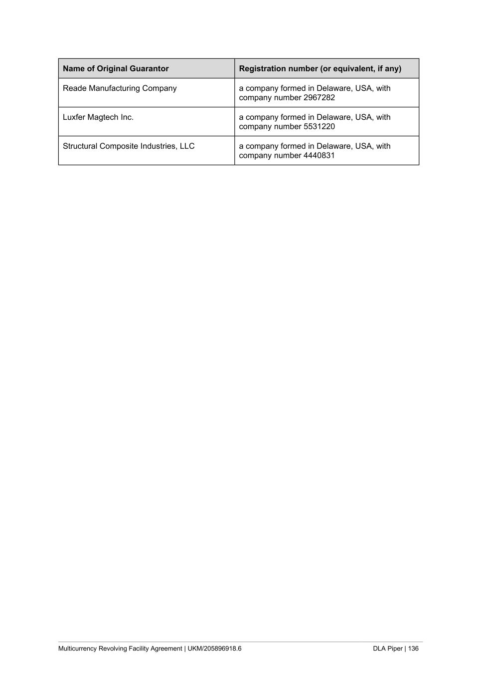 Multicurrency Revolving Facility Agreement | UKM/205896918.6 DLA Piper | 136 Name of Original Guarantor Registration number (or equivalent, if any) Reade Manufacturing Company a company formed in Delaware, USA, with company number 2967282 Luxfer Magtech Inc. a company formed in Delaware, USA, with company number 5531220 Structural Composite Industries, LLC a company formed in Delaware, USA, with company number 4440831