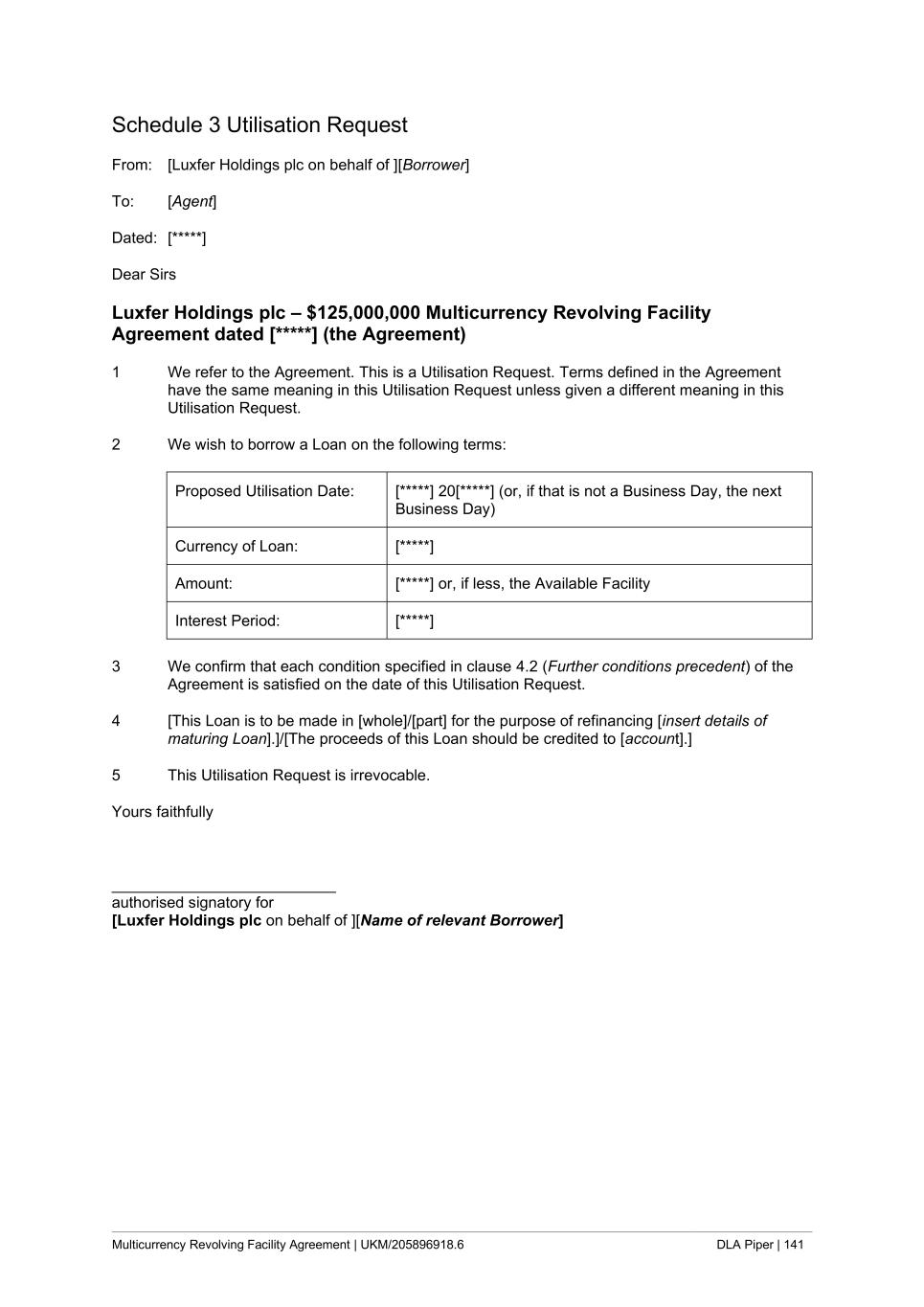 Multicurrency Revolving Facility Agreement | UKM/205896918.6 DLA Piper | 141 Schedule 3 Utilisation Request From: [Luxfer Holdings plc on behalf of ][Borrower] To: [Agent] Dated: [*****] Dear Sirs Luxfer Holdings plc – $125,000,000 Multicurrency Revolving Facility Agreement dated [*****] (the Agreement) 1 We refer to the Agreement. This is a Utilisation Request. Terms defined in the Agreement have the same meaning in this Utilisation Request unless given a different meaning in this Utilisation Request. 2 We wish to borrow a Loan on the following terms: Proposed Utilisation Date: [*****] 20[*****] (or, if that is not a Business Day, the next Business Day) Currency of Loan: [*****] Amount: [*****] or, if less, the Available Facility Interest Period: [*****] 3 We confirm that each condition specified in clause 4.2 (Further conditions precedent) of the Agreement is satisfied on the date of this Utilisation Request. 4 [This Loan is to be made in [whole]/[part] for the purpose of refinancing [insert details of maturing Loan].]/[The proceeds of this Loan should be credited to [account].] 5 This Utilisation Request is irrevocable. Yours faithfully __________________________ authorised signatory for [Luxfer Holdings plc on behalf of ][Name of relevant Borrower]