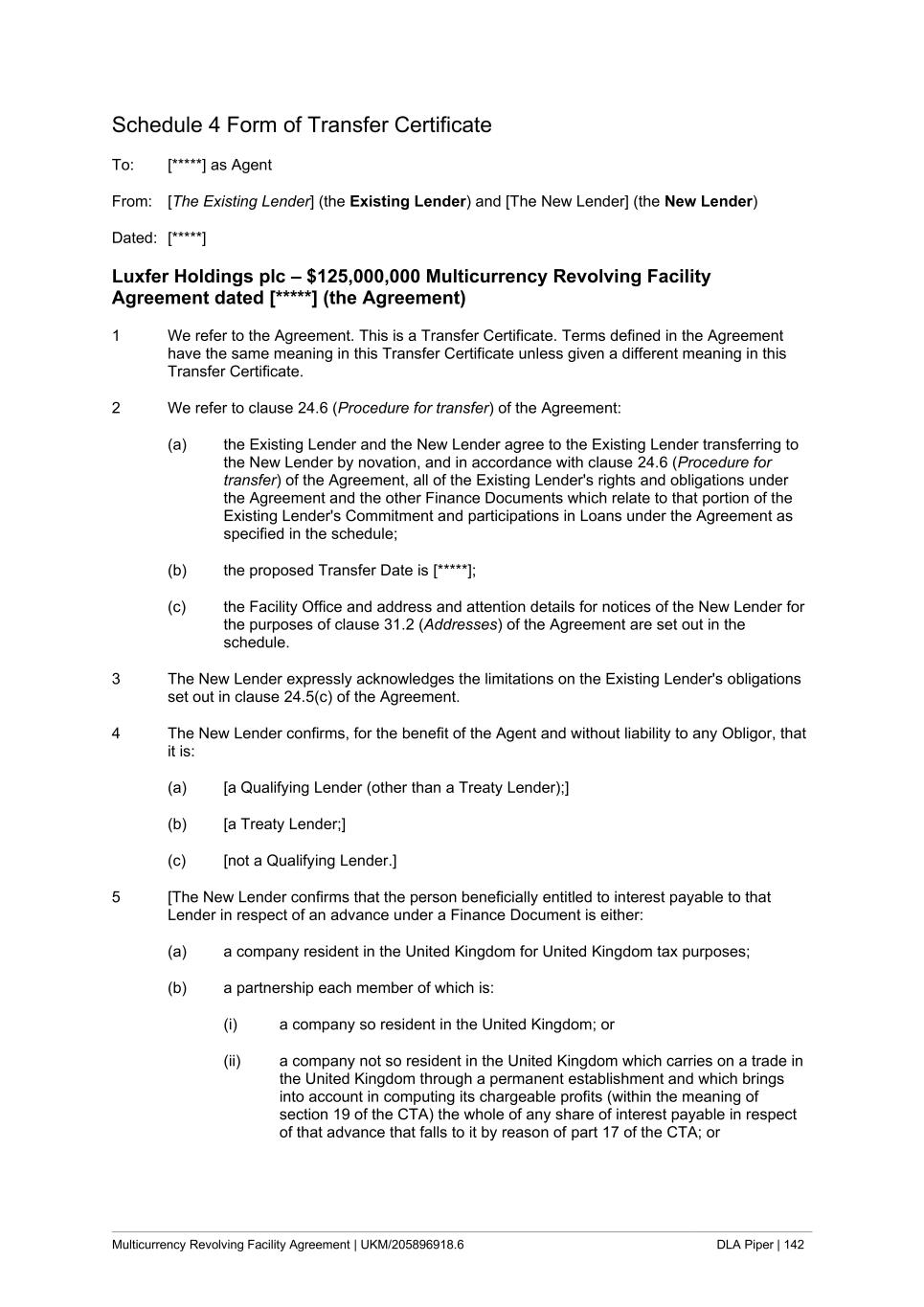 Multicurrency Revolving Facility Agreement | UKM/205896918.6 DLA Piper | 142 Schedule 4 Form of Transfer Certificate To: [*****] as Agent From: [The Existing Lender] (the Existing Lender) and [The New Lender] (the New Lender) Dated: [*****] Luxfer Holdings plc – $125,000,000 Multicurrency Revolving Facility Agreement dated [*****] (the Agreement) 1 We refer to the Agreement. This is a Transfer Certificate. Terms defined in the Agreement have the same meaning in this Transfer Certificate unless given a different meaning in this Transfer Certificate. 2 We refer to clause 24.6 (Procedure for transfer) of the Agreement: (a) the Existing Lender and the New Lender agree to the Existing Lender transferring to the New Lender by novation, and in accordance with clause 24.6 (Procedure for transfer) of the Agreement, all of the Existing Lender's rights and obligations under the Agreement and the other Finance Documents which relate to that portion of the Existing Lender's Commitment and participations in Loans under the Agreement as specified in the schedule; (b) the proposed Transfer Date is [*****]; (c) the Facility Office and address and attention details for notices of the New Lender for the purposes of clause 31.2 (Addresses) of the Agreement are set out in the schedule. 3 The New Lender expressly acknowledges the limitations on the Existing Lender's obligations set out in clause 24.5(c) of the Agreement. 4 The New Lender confirms, for the benefit of the Agent and without liability to any Obligor, that it is: (a) [a Qualifying Lender (other than a Treaty Lender);] (b) [a Treaty Lender;] (c) [not a Qualifying Lender.] 5 [The New Lender confirms that the person beneficially entitled to interest payable to that Lender in respect of an advance under a Finance Document is either: (a) a company resident in the United Kingdom for United Kingdom tax purposes; (b) a partnership each member of which is: (i) a company so resident in the United Kingdom; or (ii) a company not so resident in the United Kingdom which carries on a trade in the United Kingdom through a permanent establishment and which brings into account in computing its chargeable profits (within the meaning of section 19 of the CTA) the whole of any share of interest payable in respect of that advance that falls to it by reason of part 17 of the CTA; or