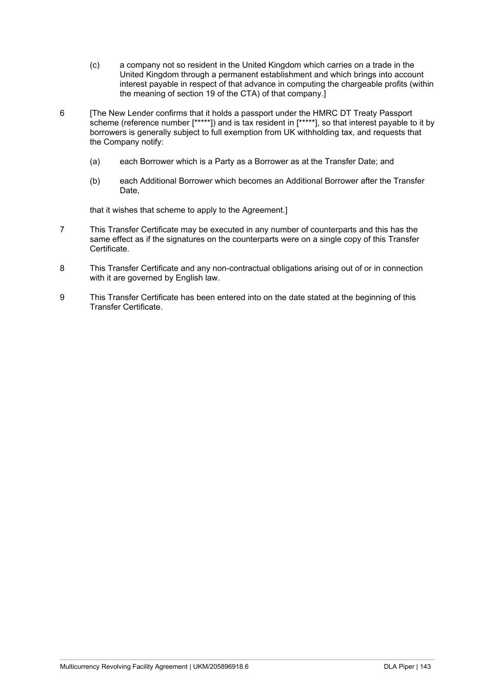 Multicurrency Revolving Facility Agreement | UKM/205896918.6 DLA Piper | 143 (c) a company not so resident in the United Kingdom which carries on a trade in the United Kingdom through a permanent establishment and which brings into account interest payable in respect of that advance in computing the chargeable profits (within the meaning of section 19 of the CTA) of that company.] 6 [The New Lender confirms that it holds a passport under the HMRC DT Treaty Passport scheme (reference number [*****]) and is tax resident in [*****], so that interest payable to it by borrowers is generally subject to full exemption from UK withholding tax, and requests that the Company notify: (a) each Borrower which is a Party as a Borrower as at the Transfer Date; and (b) each Additional Borrower which becomes an Additional Borrower after the Transfer Date, that it wishes that scheme to apply to the Agreement.] 7 This Transfer Certificate may be executed in any number of counterparts and this has the same effect as if the signatures on the counterparts were on a single copy of this Transfer Certificate. 8 This Transfer Certificate and any non-contractual obligations arising out of or in connection with it are governed by English law. 9 This Transfer Certificate has been entered into on the date stated at the beginning of this Transfer Certificate.