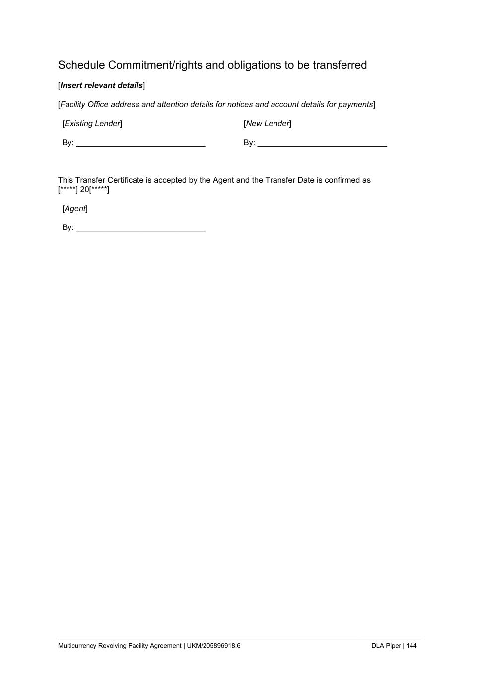 Multicurrency Revolving Facility Agreement | UKM/205896918.6 DLA Piper | 144 Schedule Commitment/rights and obligations to be transferred [Insert relevant details] [Facility Office address and attention details for notices and account details for payments] [Existing Lender] [New Lender] By: _____________________________ By: _____________________________ This Transfer Certificate is accepted by the Agent and the Transfer Date is confirmed as [*****] 20[*****] [Agent] By: _____________________________