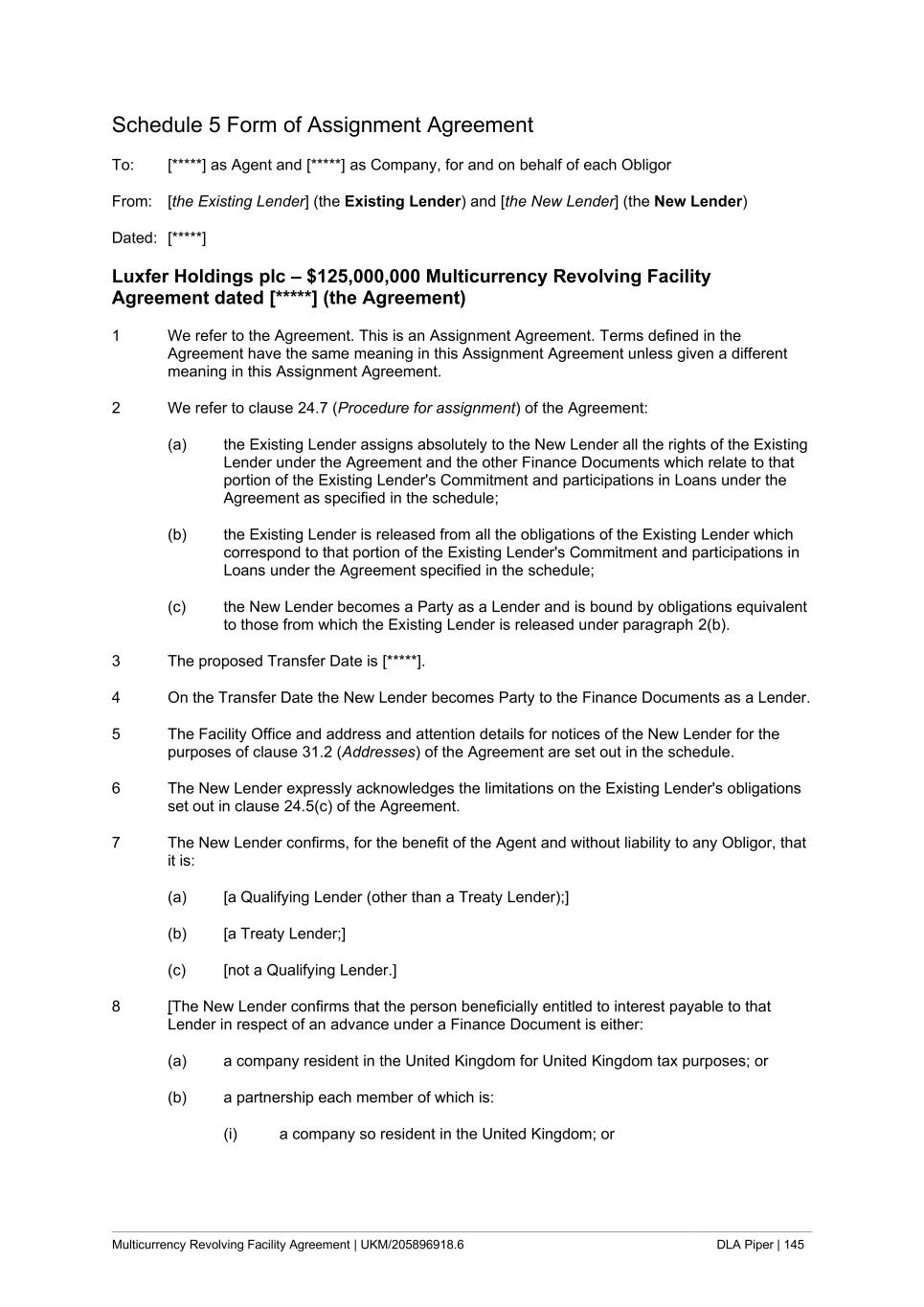 Multicurrency Revolving Facility Agreement | UKM/205896918.6 DLA Piper | 145 Schedule 5 Form of Assignment Agreement To: [*****] as Agent and [*****] as Company, for and on behalf of each Obligor From: [the Existing Lender] (the Existing Lender) and [the New Lender] (the New Lender) Dated: [*****] Luxfer Holdings plc – $125,000,000 Multicurrency Revolving Facility Agreement dated [*****] (the Agreement) 1 We refer to the Agreement. This is an Assignment Agreement. Terms defined in the Agreement have the same meaning in this Assignment Agreement unless given a different meaning in this Assignment Agreement. 2 We refer to clause 24.7 (Procedure for assignment) of the Agreement: (a) the Existing Lender assigns absolutely to the New Lender all the rights of the Existing Lender under the Agreement and the other Finance Documents which relate to that portion of the Existing Lender's Commitment and participations in Loans under the Agreement as specified in the schedule; (b) the Existing Lender is released from all the obligations of the Existing Lender which correspond to that portion of the Existing Lender's Commitment and participations in Loans under the Agreement specified in the schedule; (c) the New Lender becomes a Party as a Lender and is bound by obligations equivalent to those from which the Existing Lender is released under paragraph 2(b). 3 The proposed Transfer Date is [*****]. 4 On the Transfer Date the New Lender becomes Party to the Finance Documents as a Lender. 5 The Facility Office and address and attention details for notices of the New Lender for the purposes of clause 31.2 (Addresses) of the Agreement are set out in the schedule. 6 The New Lender expressly acknowledges the limitations on the Existing Lender's obligations set out in clause 24.5(c) of the Agreement. 7 The New Lender confirms, for the benefit of the Agent and without liability to any Obligor, that it is: (a) [a Qualifying Lender (other than a Treaty Lender);] (b) [a Treaty Lender;] (c) [not a Qualifying Lender.] 8 [The New Lender confirms that the person beneficially entitled to interest payable to that Lender in respect of an advance under a Finance Document is either: (a) a company resident in the United Kingdom for United Kingdom tax purposes; or (b) a partnership each member of which is: (i) a company so resident in the United Kingdom; or