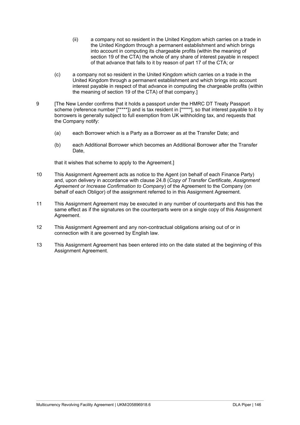 Multicurrency Revolving Facility Agreement | UKM/205896918.6 DLA Piper | 146 (ii) a company not so resident in the United Kingdom which carries on a trade in the United Kingdom through a permanent establishment and which brings into account in computing its chargeable profits (within the meaning of section 19 of the CTA) the whole of any share of interest payable in respect of that advance that falls to it by reason of part 17 of the CTA; or (c) a company not so resident in the United Kingdom which carries on a trade in the United Kingdom through a permanent establishment and which brings into account interest payable in respect of that advance in computing the chargeable profits (within the meaning of section 19 of the CTA) of that company.] 9 [The New Lender confirms that it holds a passport under the HMRC DT Treaty Passport scheme (reference number [*****]) and is tax resident in [*****], so that interest payable to it by borrowers is generally subject to full exemption from UK withholding tax, and requests that the Company notify: (a) each Borrower which is a Party as a Borrower as at the Transfer Date; and (b) each Additional Borrower which becomes an Additional Borrower after the Transfer Date, that it wishes that scheme to apply to the Agreement.] 10 This Assignment Agreement acts as notice to the Agent (on behalf of each Finance Party) and, upon delivery in accordance with clause 24.8 (Copy of Transfer Certificate, Assignment Agreement or Increase Confirmation to Company) of the Agreement to the Company (on behalf of each Obligor) of the assignment referred to in this Assignment Agreement. 11 This Assignment Agreement may be executed in any number of counterparts and this has the same effect as if the signatures on the counterparts were on a single copy of this Assignment Agreement. 12 This Assignment Agreement and any non-contractual obligations arising out of or in connection with it are governed by English law. 13 This Assignment Agreement has been entered into on the date stated at the beginning of this Assignment Agreement.