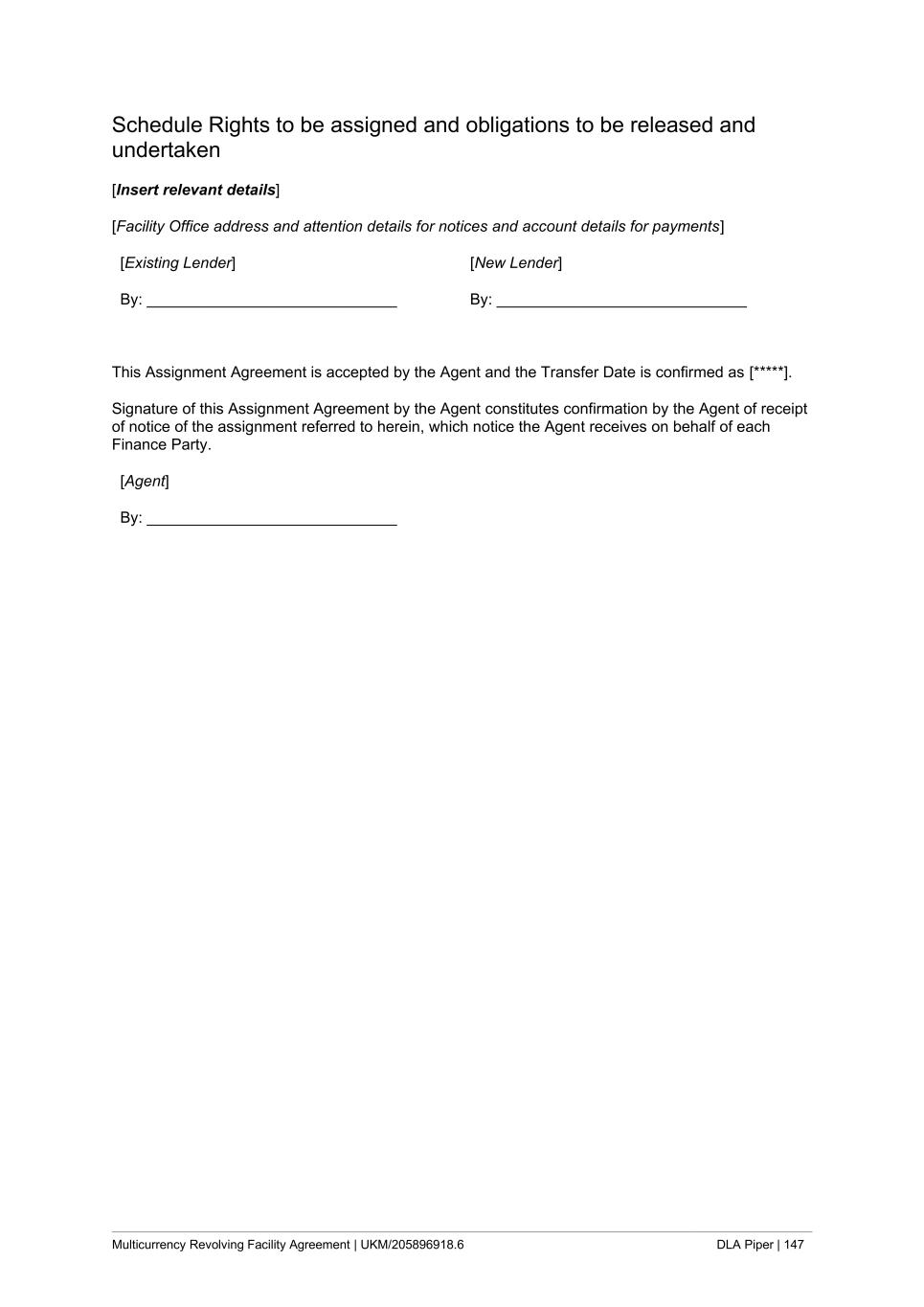 Multicurrency Revolving Facility Agreement | UKM/205896918.6 DLA Piper | 147 Schedule Rights to be assigned and obligations to be released and undertaken [Insert relevant details] [Facility Office address and attention details for notices and account details for payments] [Existing Lender] [New Lender] By: _____________________________ By: _____________________________ This Assignment Agreement is accepted by the Agent and the Transfer Date is confirmed as [*****]. Signature of this Assignment Agreement by the Agent constitutes confirmation by the Agent of receipt of notice of the assignment referred to herein, which notice the Agent receives on behalf of each Finance Party. [Agent] By: _____________________________