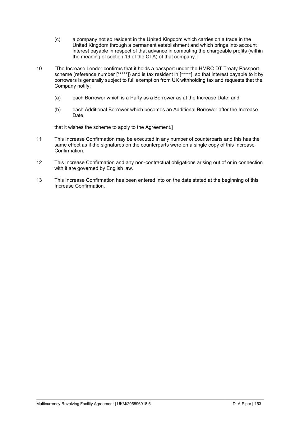 Multicurrency Revolving Facility Agreement | UKM/205896918.6 DLA Piper | 153 (c) a company not so resident in the United Kingdom which carries on a trade in the United Kingdom through a permanent establishment and which brings into account interest payable in respect of that advance in computing the chargeable profits (within the meaning of section 19 of the CTA) of that company.] 10 [The Increase Lender confirms that it holds a passport under the HMRC DT Treaty Passport scheme (reference number [*****]) and is tax resident in [*****], so that interest payable to it by borrowers is generally subject to full exemption from UK withholding tax and requests that the Company notify: (a) each Borrower which is a Party as a Borrower as at the Increase Date; and (b) each Additional Borrower which becomes an Additional Borrower after the Increase Date, that it wishes the scheme to apply to the Agreement.] 11 This Increase Confirmation may be executed in any number of counterparts and this has the same effect as if the signatures on the counterparts were on a single copy of this Increase Confirmation. 12 This Increase Confirmation and any non-contractual obligations arising out of or in connection with it are governed by English law. 13 This Increase Confirmation has been entered into on the date stated at the beginning of this Increase Confirmation.
