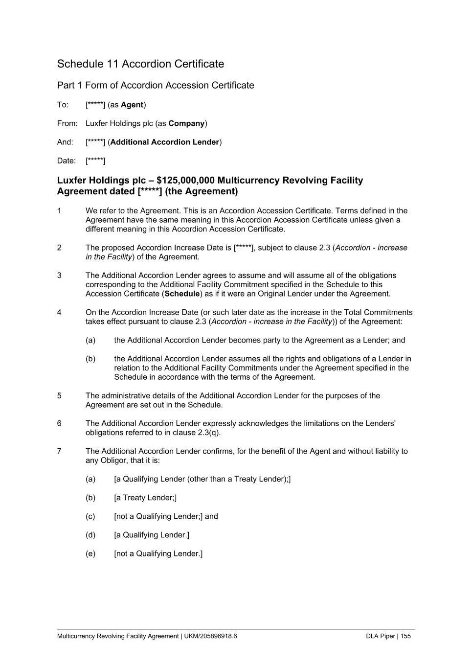 Multicurrency Revolving Facility Agreement | UKM/205896918.6 DLA Piper | 155 Schedule 11 Accordion Certificate Part 1 Form of Accordion Accession Certificate To: [*****] (as Agent) From: Luxfer Holdings plc (as Company) And: [*****] (Additional Accordion Lender) Date: [*****] Luxfer Holdings plc – $125,000,000 Multicurrency Revolving Facility Agreement dated [*****] (the Agreement) 1 We refer to the Agreement. This is an Accordion Accession Certificate. Terms defined in the Agreement have the same meaning in this Accordion Accession Certificate unless given a different meaning in this Accordion Accession Certificate. 2 The proposed Accordion Increase Date is [*****], subject to clause 2.3 (Accordion - increase in the Facility) of the Agreement. 3 The Additional Accordion Lender agrees to assume and will assume all of the obligations corresponding to the Additional Facility Commitment specified in the Schedule to this Accession Certificate (Schedule) as if it were an Original Lender under the Agreement. 4 On the Accordion Increase Date (or such later date as the increase in the Total Commitments takes effect pursuant to clause 2.3 (Accordion - increase in the Facility)) of the Agreement: (a) the Additional Accordion Lender becomes party to the Agreement as a Lender; and (b) the Additional Accordion Lender assumes all the rights and obligations of a Lender in relation to the Additional Facility Commitments under the Agreement specified in the Schedule in accordance with the terms of the Agreement. 5 The administrative details of the Additional Accordion Lender for the purposes of the Agreement are set out in the Schedule. 6 The Additional Accordion Lender expressly acknowledges the limitations on the Lenders' obligations referred to in clause 2.3(q). 7 The Additional Accordion Lender confirms, for the benefit of the Agent and without liability to any Obligor, that it is: (a) [a Qualifying Lender (other than a Treaty Lender);] (b) [a Treaty Lender;] (c) [not a Qualifying Lender;] and (d) [a Qualifying Lender.] (e) [not a Qualifying Lender.]