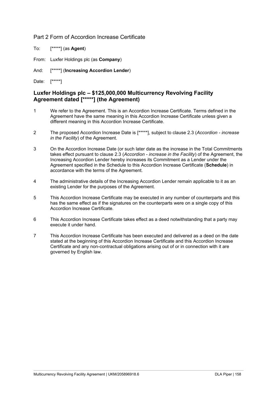 Multicurrency Revolving Facility Agreement | UKM/205896918.6 DLA Piper | 158 Part 2 Form of Accordion Increase Certificate To: [*****] (as Agent) From: Luxfer Holdings plc (as Company) And: [*****] (Increasing Accordion Lender) Date: [*****] Luxfer Holdings plc – $125,000,000 Multicurrency Revolving Facility Agreement dated [*****] (the Agreement) 1 We refer to the Agreement. This is an Accordion Increase Certificate. Terms defined in the Agreement have the same meaning in this Accordion Increase Certificate unless given a different meaning in this Accordion Increase Certificate. 2 The proposed Accordion Increase Date is [*****], subject to clause 2.3 (Accordion - increase in the Facility) of the Agreement. 3 On the Accordion Increase Date (or such later date as the increase in the Total Commitments takes effect pursuant to clause 2.3 (Accordion - increase in the Facility) of the Agreement, the Increasing Accordion Lender hereby increases its Commitment as a Lender under the Agreement specified in the Schedule to this Accordion Increase Certificate (Schedule) in accordance with the terms of the Agreement. 4 The administrative details of the Increasing Accordion Lender remain applicable to it as an existing Lender for the purposes of the Agreement. 5 This Accordion Increase Certificate may be executed in any number of counterparts and this has the same effect as if the signatures on the counterparts were on a single copy of this Accordion Increase Certificate. 6 This Accordion Increase Certificate takes effect as a deed notwithstanding that a party may execute it under hand. 7 This Accordion Increase Certificate has been executed and delivered as a deed on the date stated at the beginning of this Accordion Increase Certificate and this Accordion Increase Certificate and any non-contractual obligations arising out of or in connection with it are governed by English law.