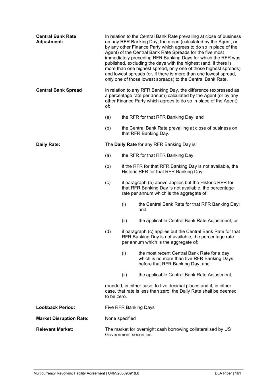Multicurrency Revolving Facility Agreement | UKM/205896918.6 DLA Piper | 161 Central Bank Rate Adjustment: In relation to the Central Bank Rate prevailing at close of business on any RFR Banking Day, the mean (calculated by the Agent, or by any other Finance Party which agrees to do so in place of the Agent) of the Central Bank Rate Spreads for the five most immediately preceding RFR Banking Days for which the RFR was published, excluding the days with the highest (and, if there is more than one highest spread, only one of those highest spreads) and lowest spreads (or, if there is more than one lowest spread, only one of those lowest spreads) to the Central Bank Rate. Central Bank Spread In relation to any RFR Banking Day, the difference (expressed as a percentage rate per annum) calculated by the Agent (or by any other Finance Party which agrees to do so in place of the Agent) of: (a) the RFR for that RFR Banking Day; and (b) the Central Bank Rate prevailing at close of business on that RFR Banking Day. Daily Rate: The Daily Rate for any RFR Banking Day is: (a) the RFR for that RFR Banking Day; (b) if the RFR for that RFR Banking Day is not available, the Historic RFR for that RFR Banking Day; (c) if paragraph (b) above applies but the Historic RFR for that RFR Banking Day is not available, the percentage rate per annum which is the aggregate of: (i) the Central Bank Rate for that RFR Banking Day; and (ii) the applicable Central Bank Rate Adjustment; or (d) if paragraph (c) applies but the Central Bank Rate for that RFR Banking Day is not available, the percentage rate per annum which is the aggregate of: (i) the most recent Central Bank Rate for a day which is no more than five RFR Banking Days before that RFR Banking Day; and (ii) the applicable Central Bank Rate Adjustment, rounded, in either case, to five decimal places and if, in either case, that rate is less than zero, the Daily Rate shall be deemed to be zero. Lookback Period: Five RFR Banking Days Market Disruption Rate: None specified Relevant Market: The market for overnight cash borrowing collateralised by US Government securities.