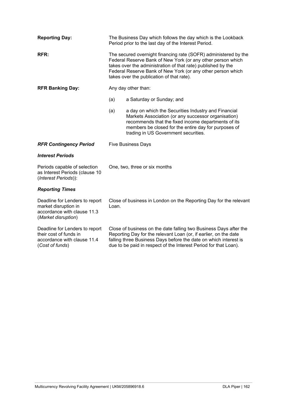 Multicurrency Revolving Facility Agreement | UKM/205896918.6 DLA Piper | 162 Reporting Day: The Business Day which follows the day which is the Lookback Period prior to the last day of the Interest Period. RFR: The secured overnight financing rate (SOFR) administered by the Federal Reserve Bank of New York (or any other person which takes over the administration of that rate) published by the Federal Reserve Bank of New York (or any other person which takes over the publication of that rate). RFR Banking Day: Any day other than: (a) a Saturday or Sunday; and (a) a day on which the Securities Industry and Financial Markets Association (or any successor organisation) recommends that the fixed income departments of its members be closed for the entire day for purposes of trading in US Government securities. RFR Contingency Period Five Business Days Interest Periods Periods capable of selection as Interest Periods (clause 10 (Interest Periods)): One, two, three or six months Reporting Times Deadline for Lenders to report market disruption in accordance with clause 11.3 (Market disruption) Close of business in London on the Reporting Day for the relevant Loan. Deadline for Lenders to report their cost of funds in accordance with clause 11.4 (Cost of funds) Close of business on the date falling two Business Days after the Reporting Day for the relevant Loan (or, if earlier, on the date falling three Business Days before the date on which interest is due to be paid in respect of the Interest Period for that Loan).