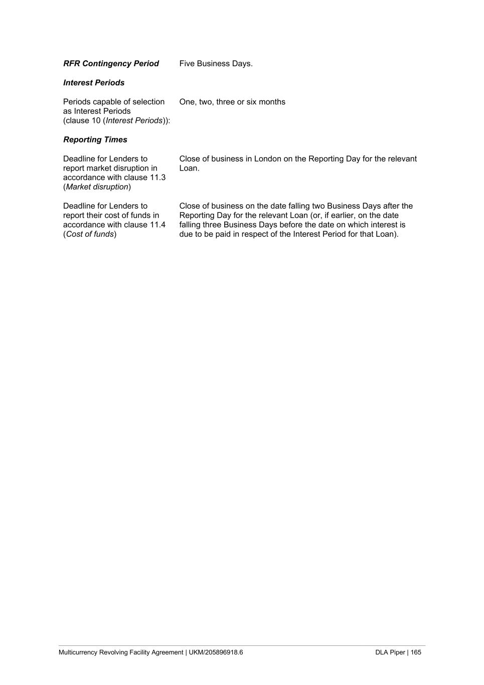 Multicurrency Revolving Facility Agreement | UKM/205896918.6 DLA Piper | 165 RFR Contingency Period Five Business Days. Interest Periods Periods capable of selection as Interest Periods (clause 10 (Interest Periods)): One, two, three or six months Reporting Times Deadline for Lenders to report market disruption in accordance with clause 11.3 (Market disruption) Close of business in London on the Reporting Day for the relevant Loan. Deadline for Lenders to report their cost of funds in accordance with clause 11.4 (Cost of funds) Close of business on the date falling two Business Days after the Reporting Day for the relevant Loan (or, if earlier, on the date falling three Business Days before the date on which interest is due to be paid in respect of the Interest Period for that Loan).