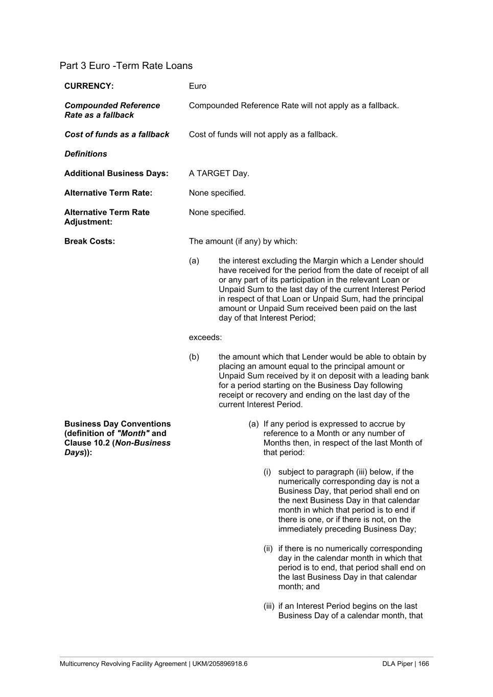 Multicurrency Revolving Facility Agreement | UKM/205896918.6 DLA Piper | 166 Part 3 Euro -Term Rate Loans CURRENCY: Euro Compounded Reference Rate as a fallback Compounded Reference Rate will not apply as a fallback. Cost of funds as a fallback Cost of funds will not apply as a fallback. Definitions Additional Business Days: A TARGET Day. Alternative Term Rate: None specified. Alternative Term Rate Adjustment: None specified. Break Costs: The amount (if any) by which: (a) the interest excluding the Margin which a Lender should have received for the period from the date of receipt of all or any part of its participation in the relevant Loan or Unpaid Sum to the last day of the current Interest Period in respect of that Loan or Unpaid Sum, had the principal amount or Unpaid Sum received been paid on the last day of that Interest Period; exceeds: (b) the amount which that Lender would be able to obtain by placing an amount equal to the principal amount or Unpaid Sum received by it on deposit with a leading bank for a period starting on the Business Day following receipt or recovery and ending on the last day of the current Interest Period. Business Day Conventions (definition of "Month" and Clause 10.2 (Non-Business Days)): (a) If any period is expressed to accrue by reference to a Month or any number of Months then, in respect of the last Month of that period: (i) subject to paragraph (iii) below, if the numerically corresponding day is not a Business Day, that period shall end on the next Business Day in that calendar month in which that period is to end if there is one, or if there is not, on the immediately preceding Business Day; (ii) if there is no numerically corresponding day in the calendar month in which that period is to end, that period shall end on the last Business Day in that calendar month; and (iii) if an Interest Period begins on the last Business Day of a calendar month, that
