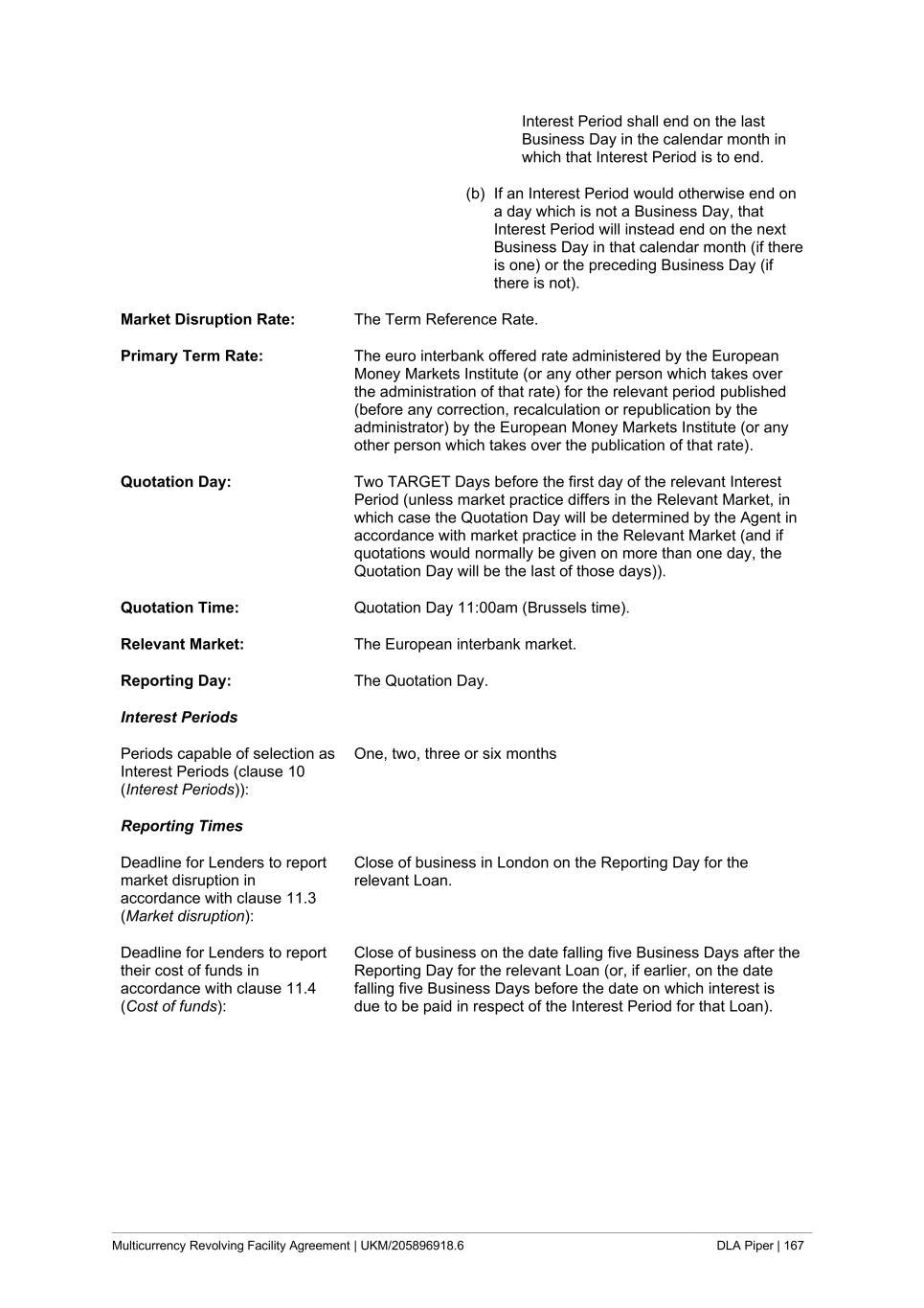 Multicurrency Revolving Facility Agreement | UKM/205896918.6 DLA Piper | 167 Interest Period shall end on the last Business Day in the calendar month in which that Interest Period is to end. (b) If an Interest Period would otherwise end on a day which is not a Business Day, that Interest Period will instead end on the next Business Day in that calendar month (if there is one) or the preceding Business Day (if there is not). Market Disruption Rate: The Term Reference Rate. Primary Term Rate: The euro interbank offered rate administered by the European Money Markets Institute (or any other person which takes over the administration of that rate) for the relevant period published (before any correction, recalculation or republication by the administrator) by the European Money Markets Institute (or any other person which takes over the publication of that rate). Quotation Day: Two TARGET Days before the first day of the relevant Interest Period (unless market practice differs in the Relevant Market, in which case the Quotation Day will be determined by the Agent in accordance with market practice in the Relevant Market (and if quotations would normally be given on more than one day, the Quotation Day will be the last of those days)). Quotation Time: Quotation Day 11:00am (Brussels time). Relevant Market: The European interbank market. Reporting Day: The Quotation Day. Interest Periods Periods capable of selection as Interest Periods (clause 10 (Interest Periods)): One, two, three or six months Reporting Times Deadline for Lenders to report market disruption in accordance with clause 11.3 (Market disruption): Close of business in London on the Reporting Day for the relevant Loan. Deadline for Lenders to report their cost of funds in accordance with clause 11.4 (Cost of funds): Close of business on the date falling five Business Days after the Reporting Day for the relevant Loan (or, if earlier, on the date falling five Business Days before the date on which interest is due to be paid in respect of the Interest Period for that Loan).
