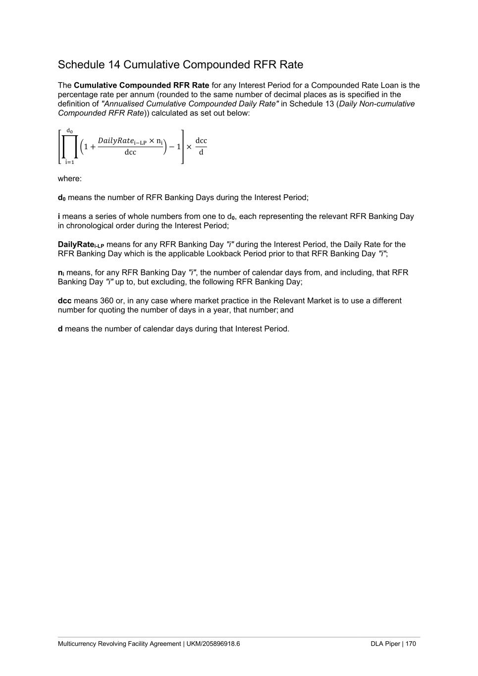 Multicurrency Revolving Facility Agreement | UKM/205896918.6 DLA Piper | 170 Schedule 14 Cumulative Compounded RFR Rate The Cumulative Compounded RFR Rate for any Interest Period for a Compounded Rate Loan is the percentage rate per annum (rounded to the same number of decimal places as is specified in the definition of "Annualised Cumulative Compounded Daily Rate" in Schedule 13 (Daily Non-cumulative Compounded RFR Rate)) calculated as set out below: [∏ (1 + 𝐷𝑎𝑖𝑙𝑦𝑅𝑎𝑡𝑒i−LP × ni dcc ) d0 i̇=1 − 1] × dcc d where: d0 means the number of RFR Banking Days during the Interest Period; i means a series of whole numbers from one to d0, each representing the relevant RFR Banking Day in chronological order during the Interest Period; DailyRatei-LP means for any RFR Banking Day "i" during the Interest Period, the Daily Rate for the RFR Banking Day which is the applicable Lookback Period prior to that RFR Banking Day "i"; ni means, for any RFR Banking Day "i", the number of calendar days from, and including, that RFR Banking Day "i" up to, but excluding, the following RFR Banking Day; dcc means 360 or, in any case where market practice in the Relevant Market is to use a different number for quoting the number of days in a year, that number; and d means the number of calendar days during that Interest Period.