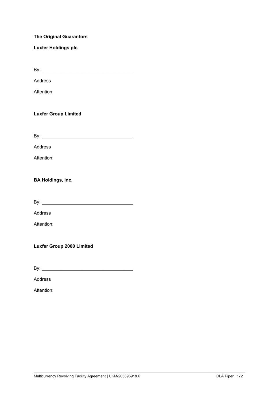 Multicurrency Revolving Facility Agreement | UKM/205896918.6 DLA Piper | 172 The Original Guarantors Luxfer Holdings plc By: ___________________________________ Address Attention: Luxfer Group Limited By: ___________________________________ Address Attention: BA Holdings, Inc. By: ___________________________________ Address Attention: Luxfer Group 2000 Limited By: ___________________________________ Address Attention: