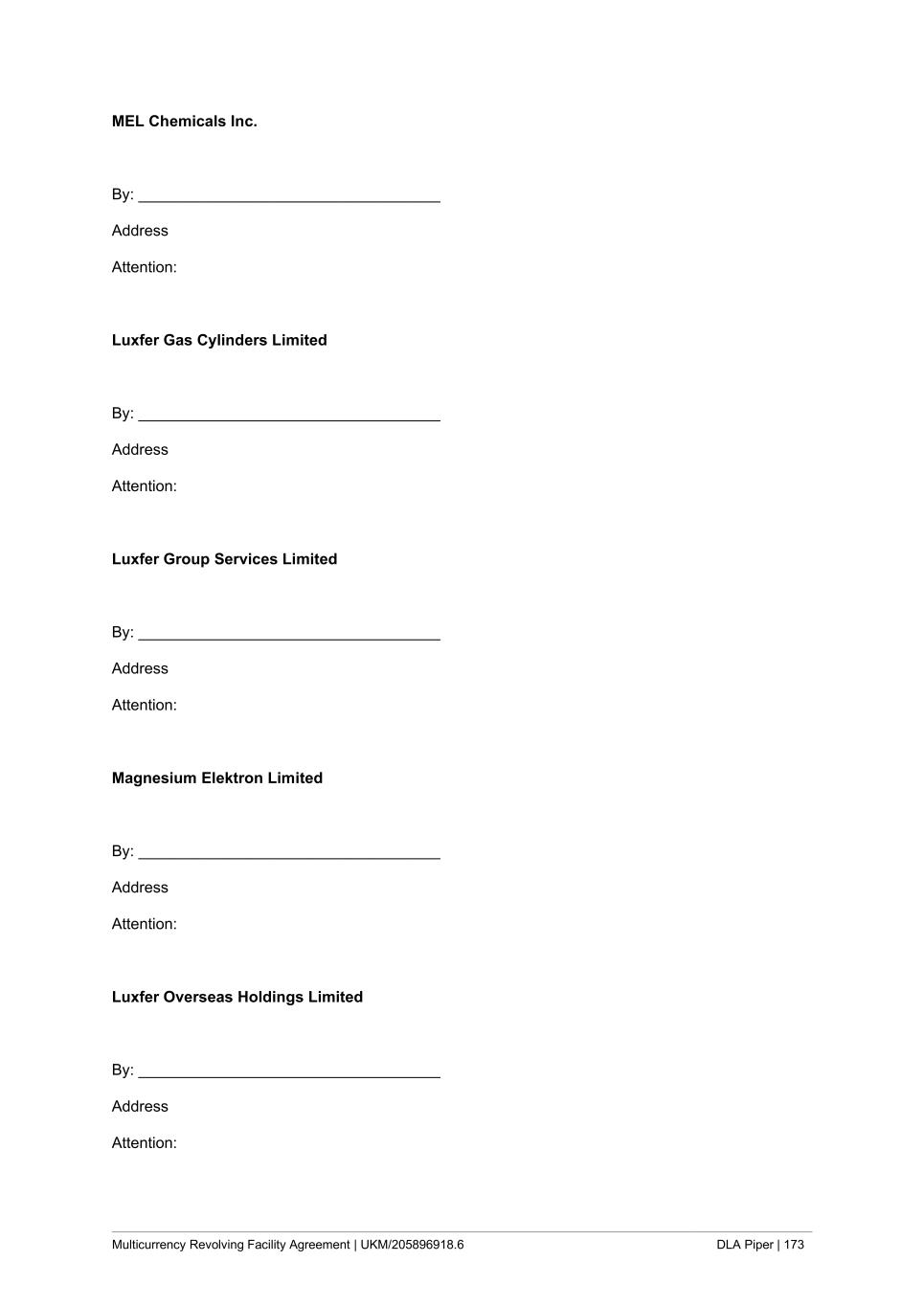 Multicurrency Revolving Facility Agreement | UKM/205896918.6 DLA Piper | 173 MEL Chemicals Inc. By: ___________________________________ Address Attention: Luxfer Gas Cylinders Limited By: ___________________________________ Address Attention: Luxfer Group Services Limited By: ___________________________________ Address Attention: Magnesium Elektron Limited By: ___________________________________ Address Attention: Luxfer Overseas Holdings Limited By: ___________________________________ Address Attention: