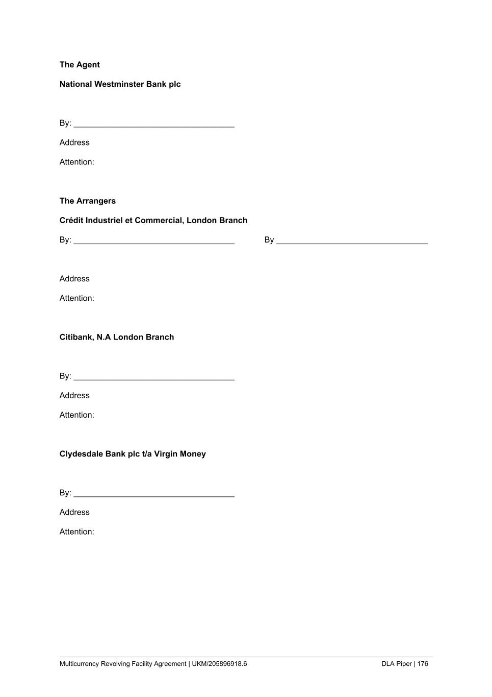 Multicurrency Revolving Facility Agreement | UKM/205896918.6 DLA Piper | 176 The Agent National Westminster Bank plc By: ___________________________________ Address Attention: The Arrangers Crédit Industriel et Commercial, London Branch By: ___________________________________ By _________________________________ Address Attention: Citibank, N.A London Branch By: ___________________________________ Address Attention: Clydesdale Bank plc t/a Virgin Money By: ___________________________________ Address Attention: