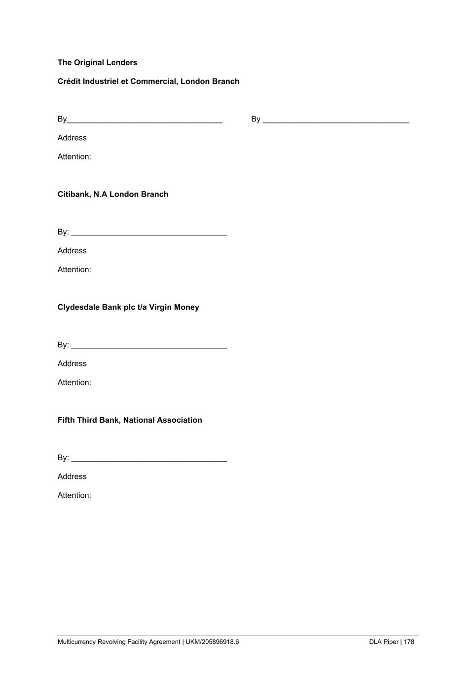 Multicurrency Revolving Facility Agreement | UKM/205896918.6 DLA Piper | 178 The Original Lenders Crédit Industriel et Commercial, London Branch By___________________________________ By _________________________________ Address Attention: Citibank, N.A London Branch By: ___________________________________ Address Attention: Clydesdale Bank plc t/a Virgin Money By: ___________________________________ Address Attention: Fifth Third Bank, National Association By: ___________________________________ Address Attention: